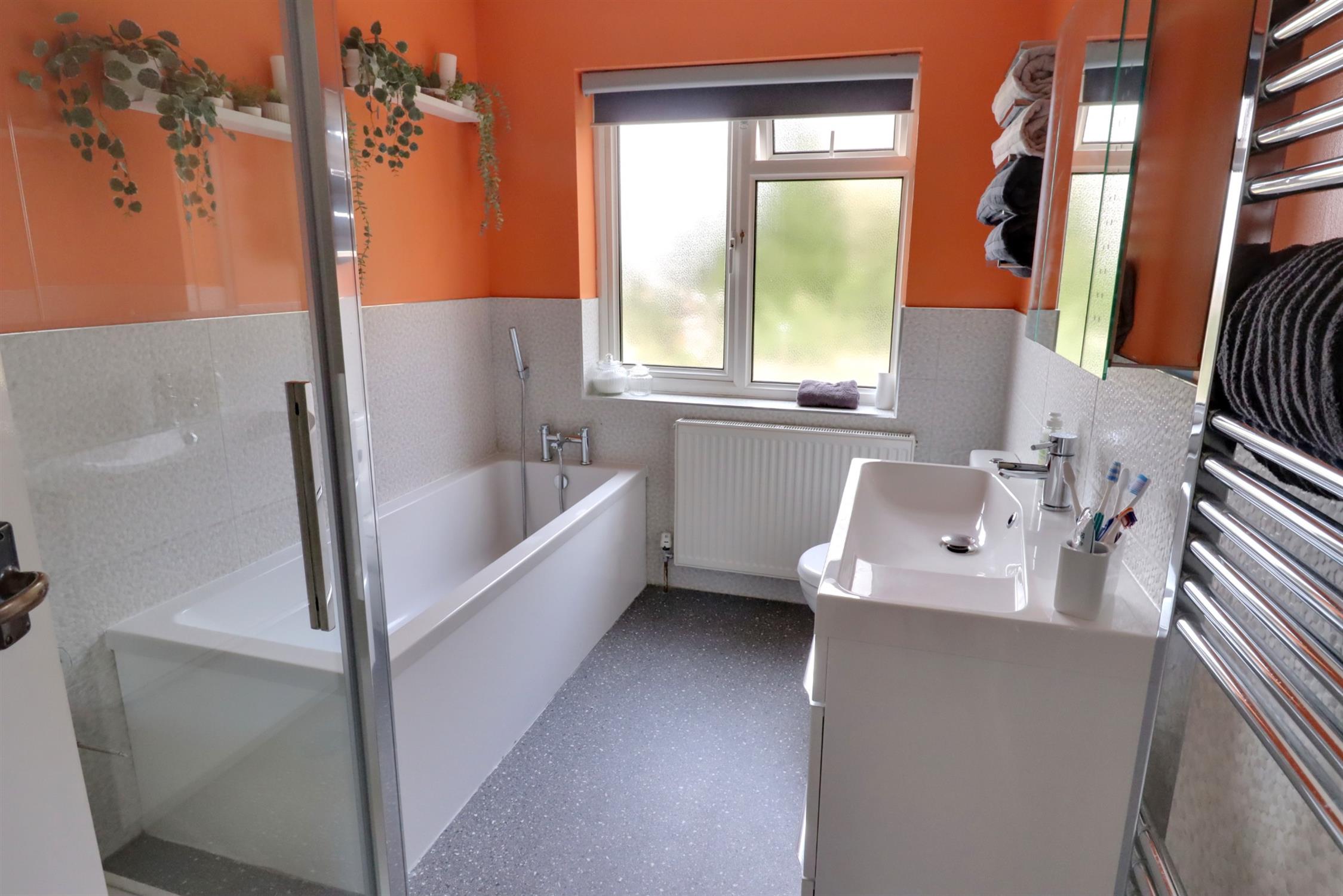 Opaque double glazed window to rear, panel enclosed bath with mixer tap shower attachment, tiled corner shower cubicle, ‘Mira’ electric shower, rainfall shower head and hand held shower attachment, W.C, hand basin with mixer tap and vanity storage under, ladder style towel radiator, ceiling extractor, electric fan heater.
