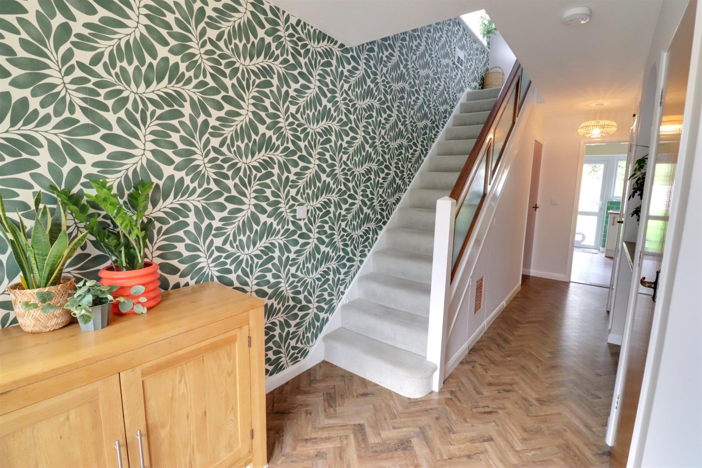 Opaque double glazed front door and side windows, radiator, two storage cupboards, understairs storage, stairs to first floor.