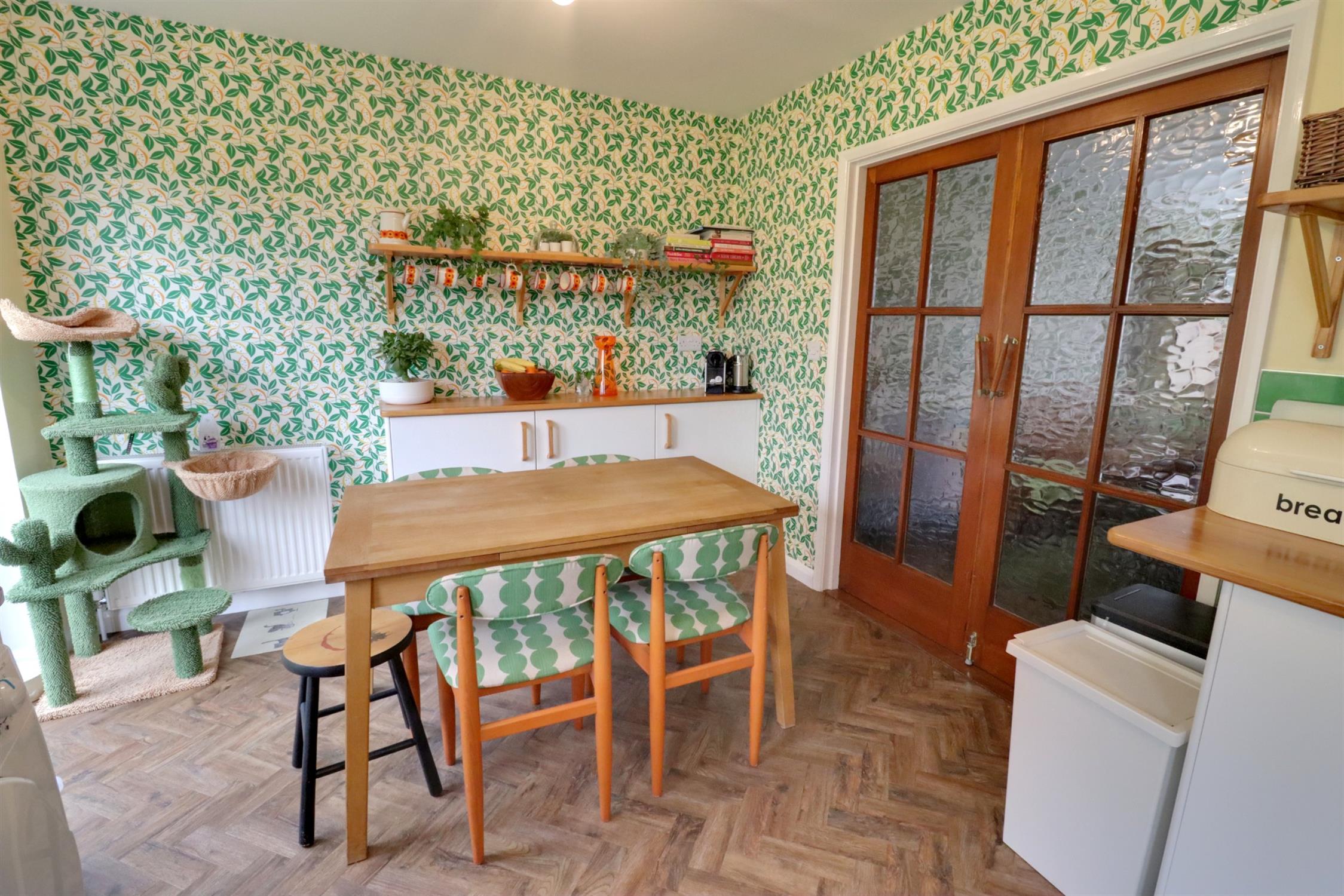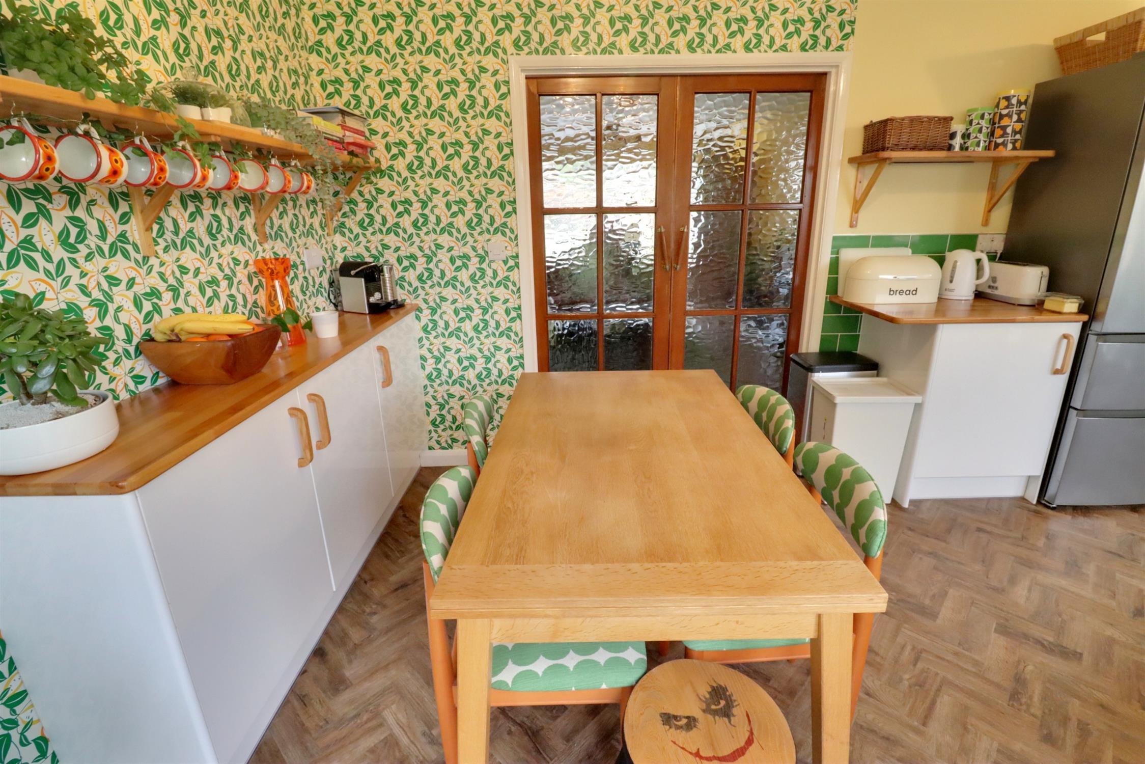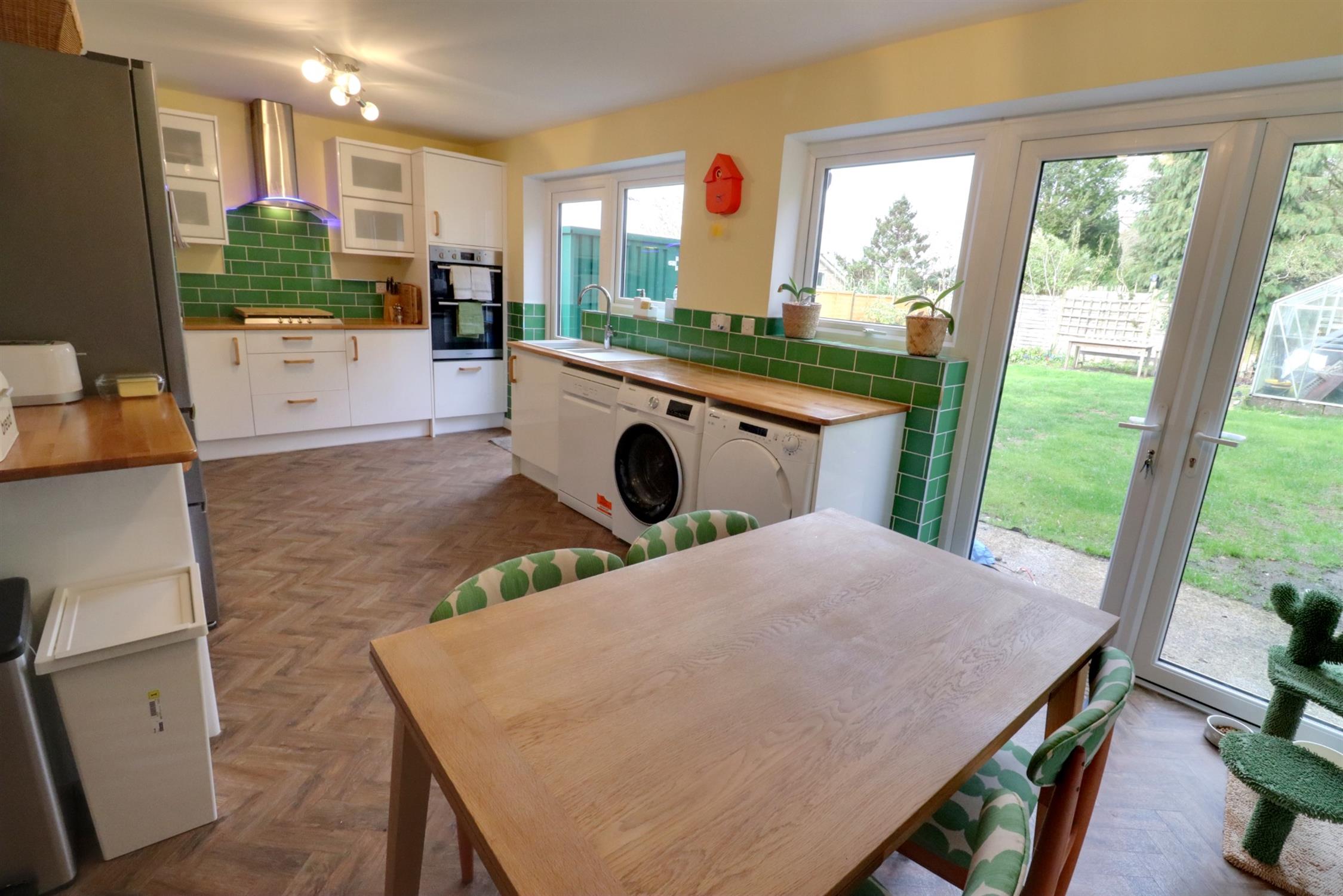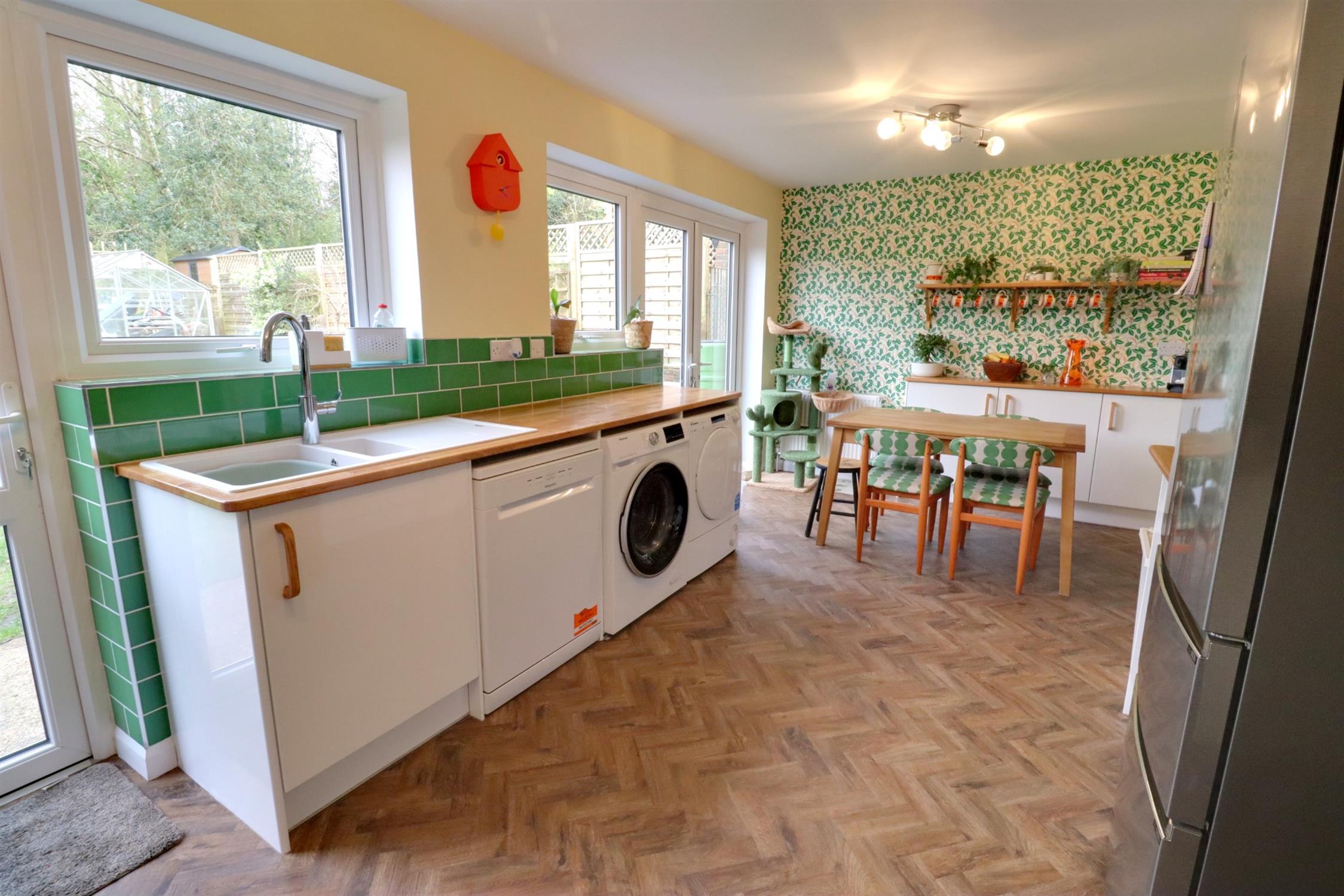 Two double glazed windows to rear, double glazed door and double glazed ‘French’ doors to rear, modern matching range of wall and base units with solid wood roll top worksurfaces, inset one and a half bowl ‘Franke’ single drainer sink with swan neck mixer tap, plumbing and space for washing machine, tumble dryer and dishwasher, electric oven and grill with overhead extractor, ‘Smeg’ four ring gas hob, radiator.