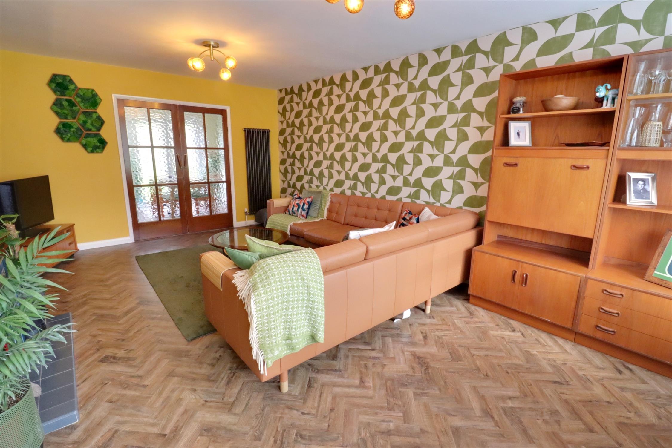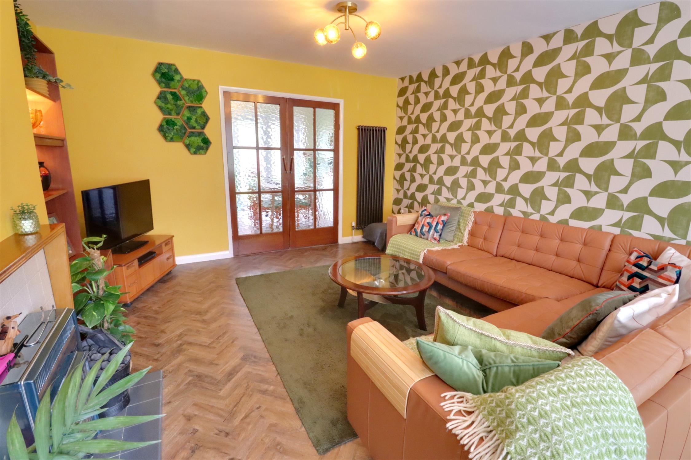 Double glazed window to front, original wood burner set in tiled hearth & surround, vertical radiator, glazed double doors to: