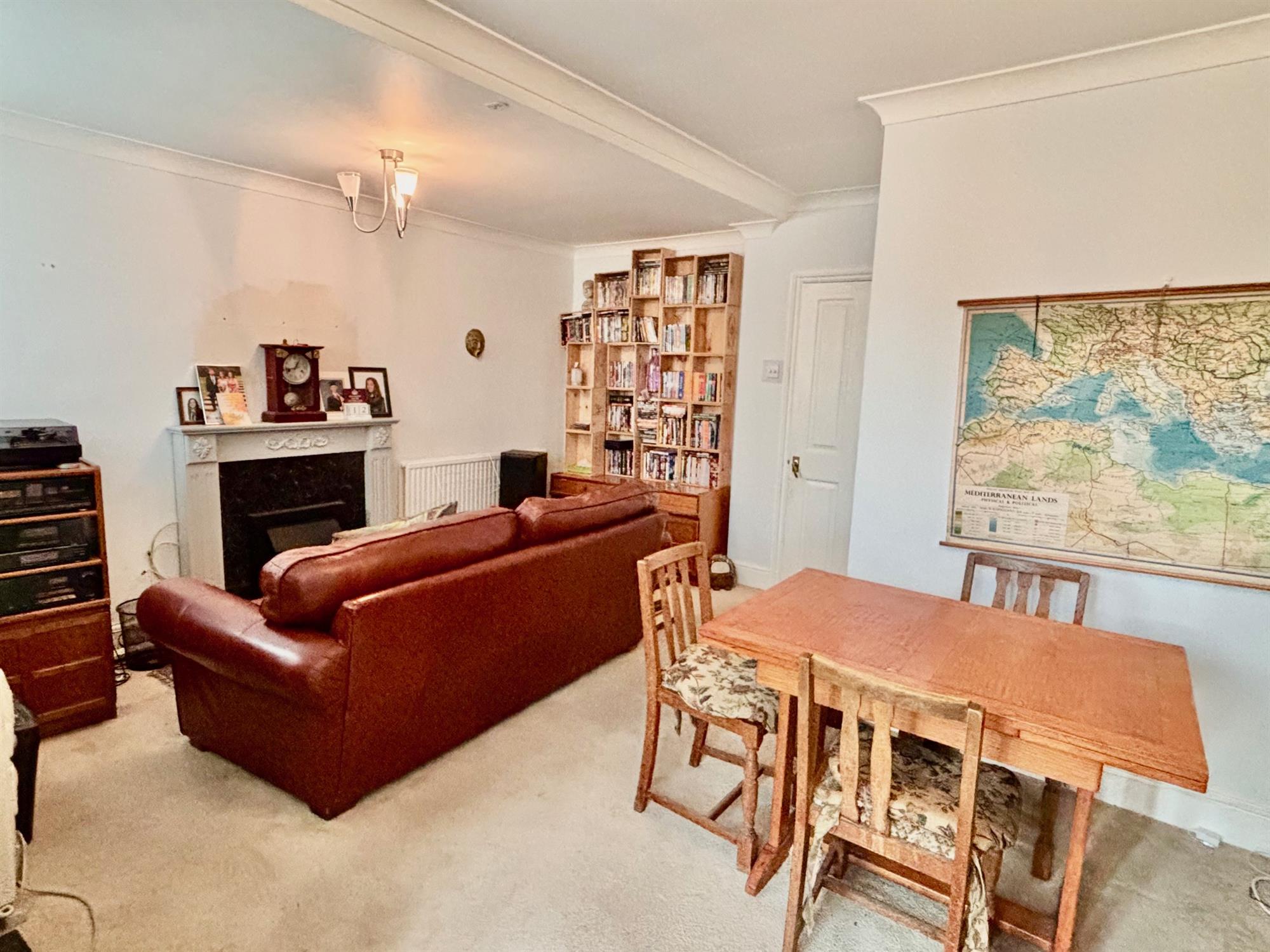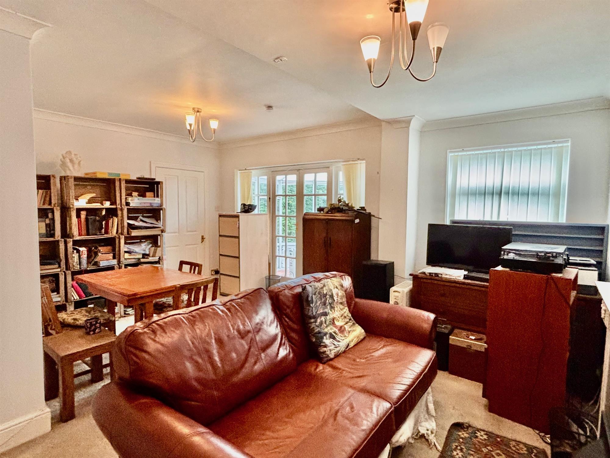 A generous living room, with space for both sitting and dining room furniture. Double doors to the conservatory.