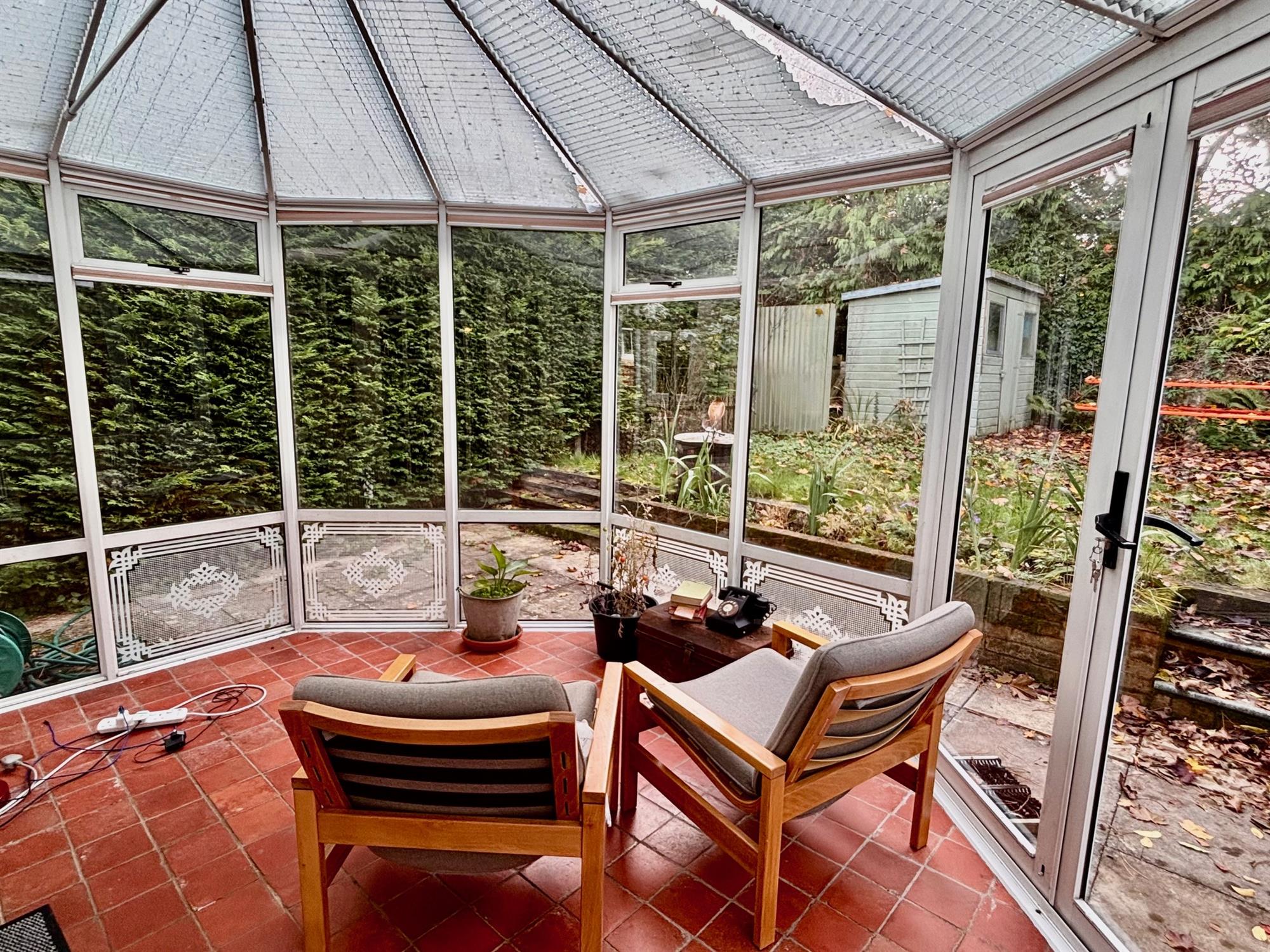 Glass conservatory, double doors to the garden.