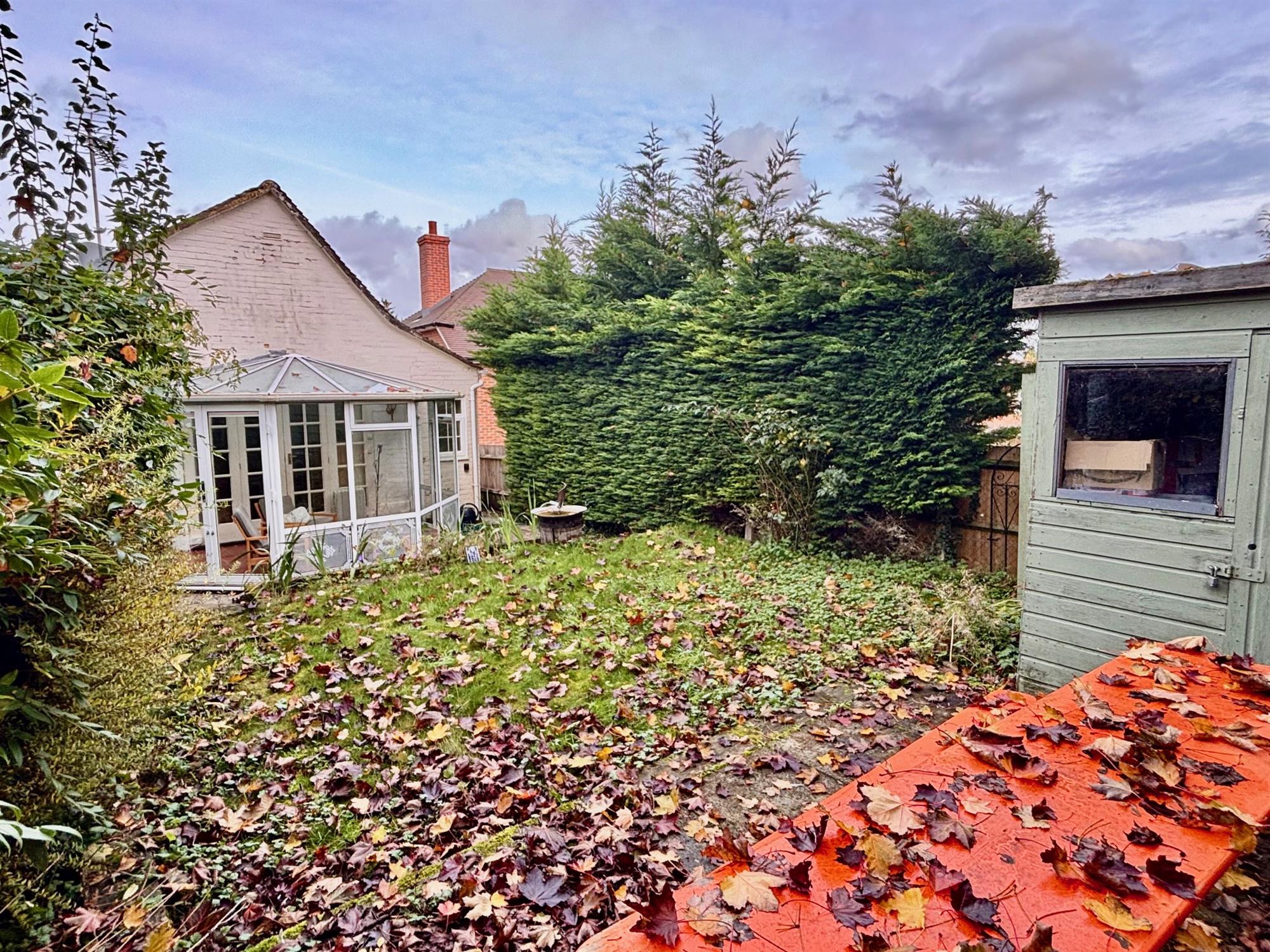 The garden faces south, with a patio, neatly kept lawn and shed. There is side access to the front garden and a driveway for off-street parking.
