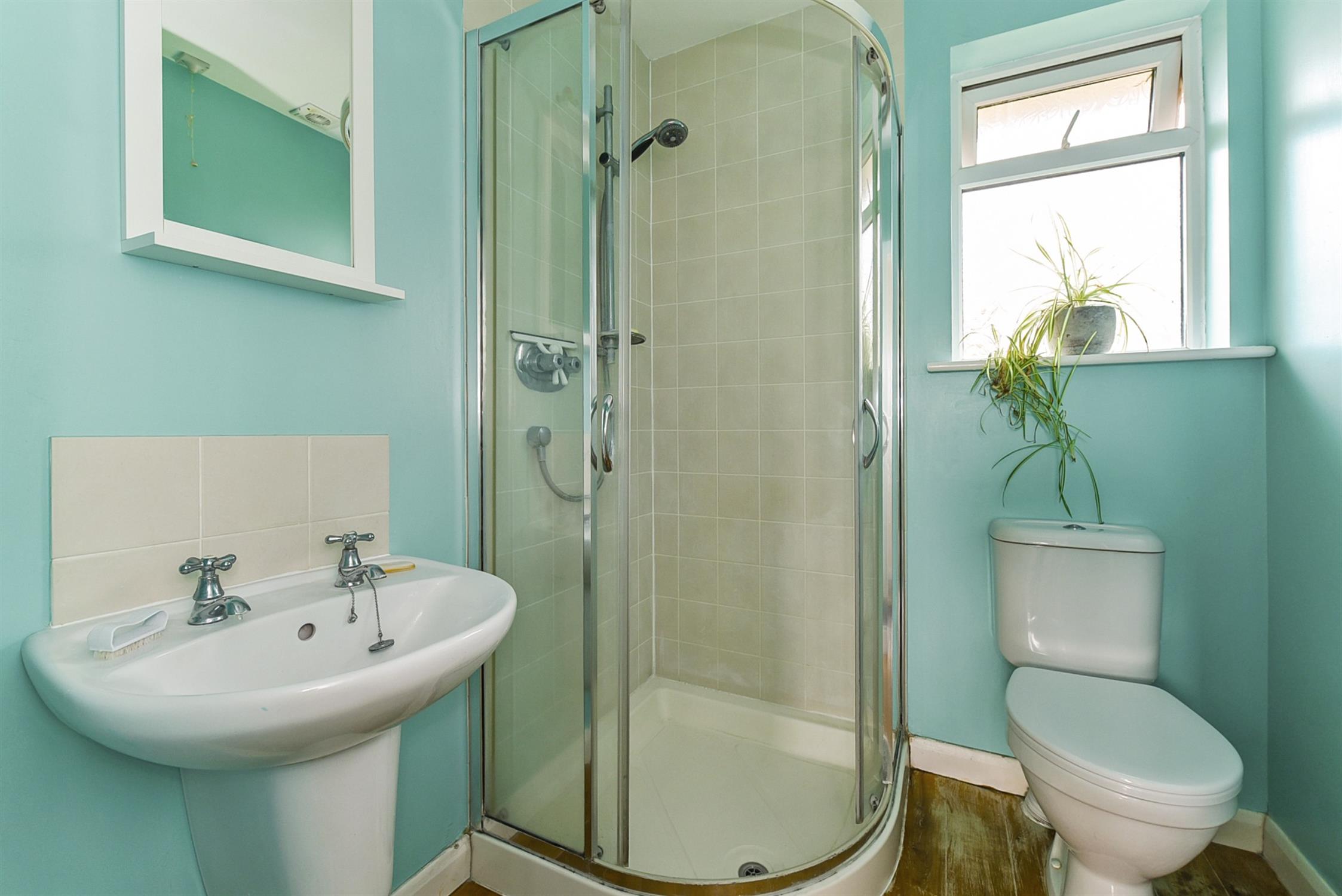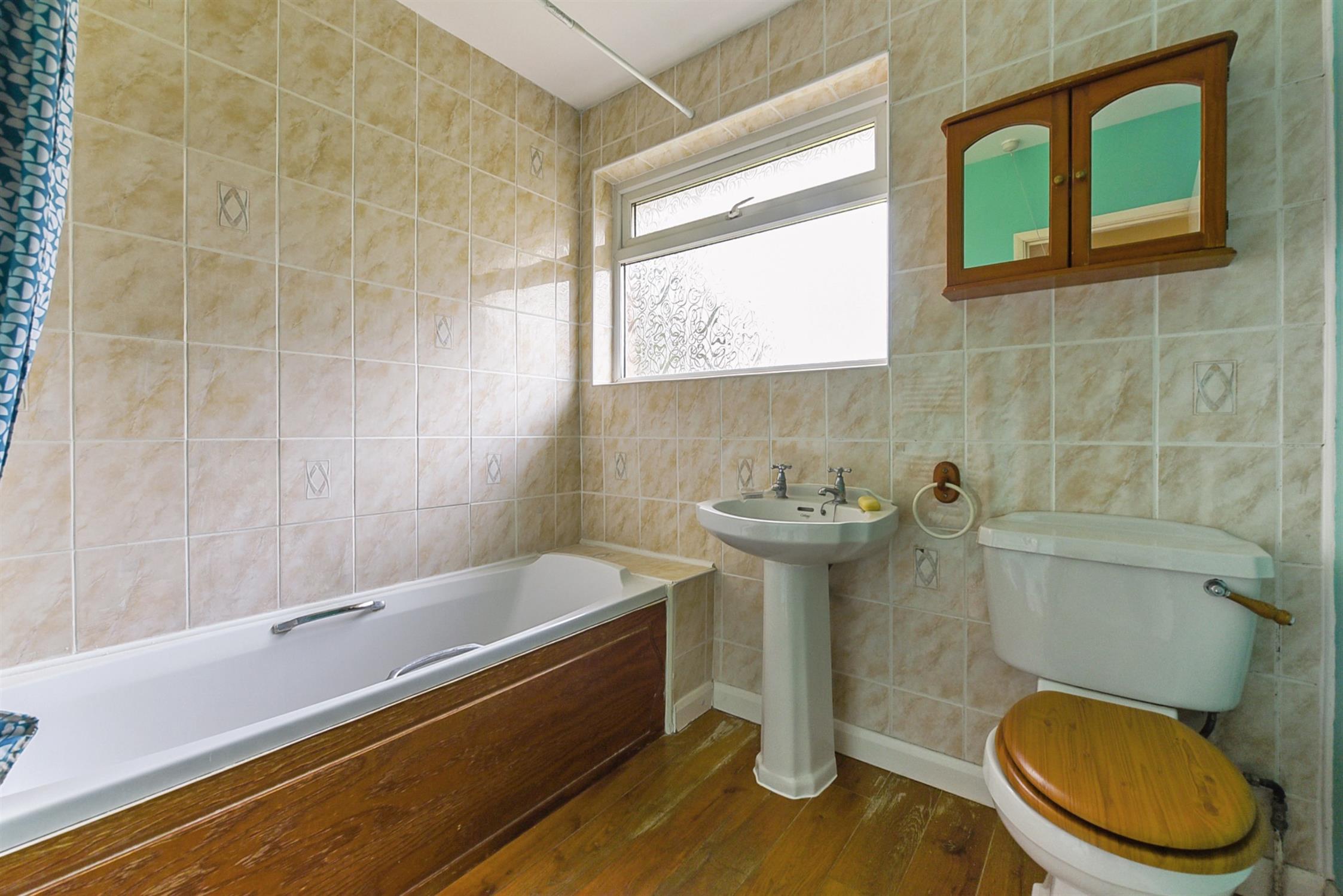 Bath with shower over. Basin. Toilet. Towel radiator.