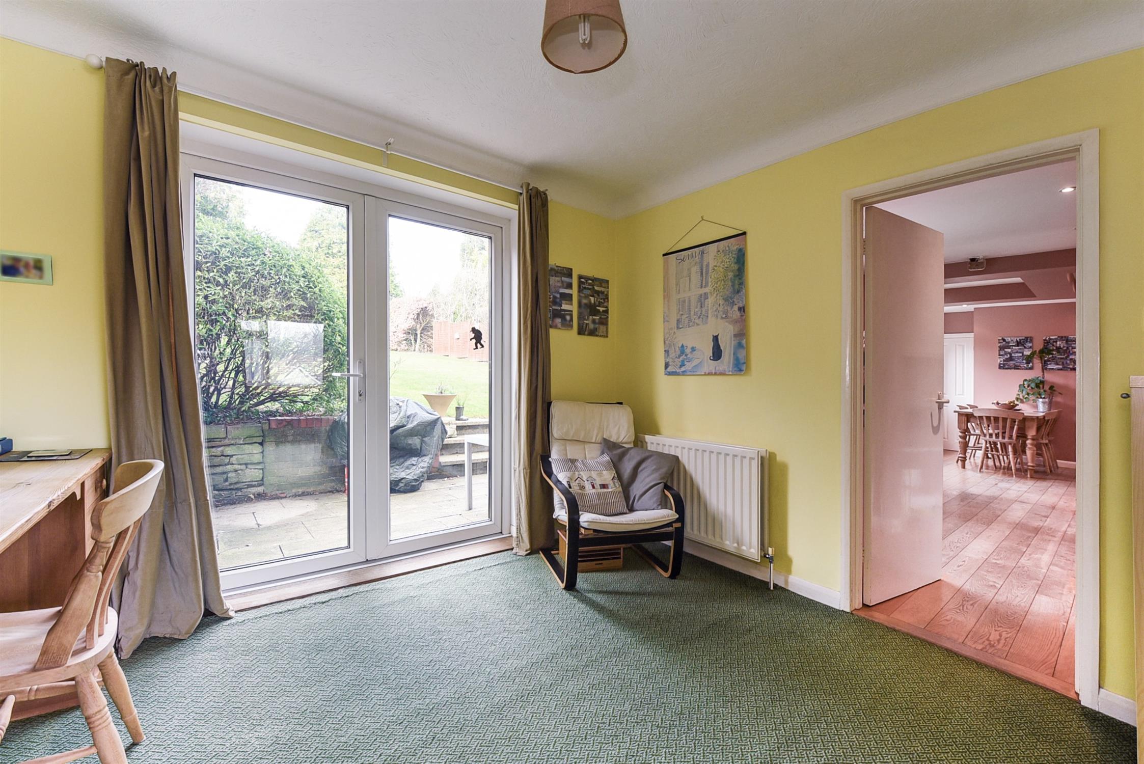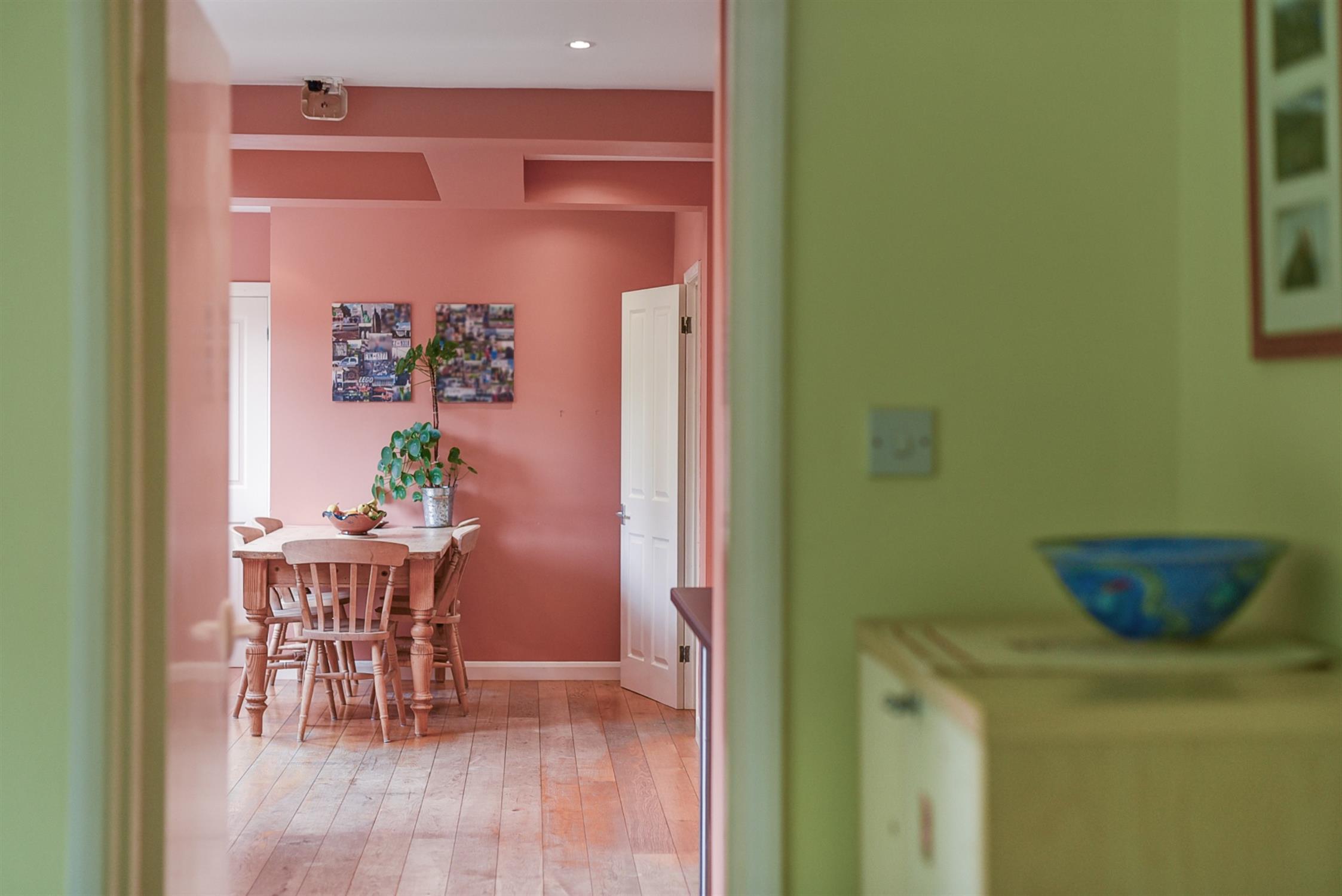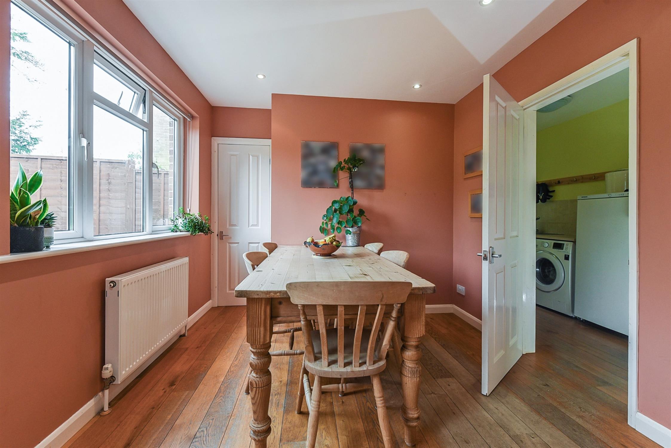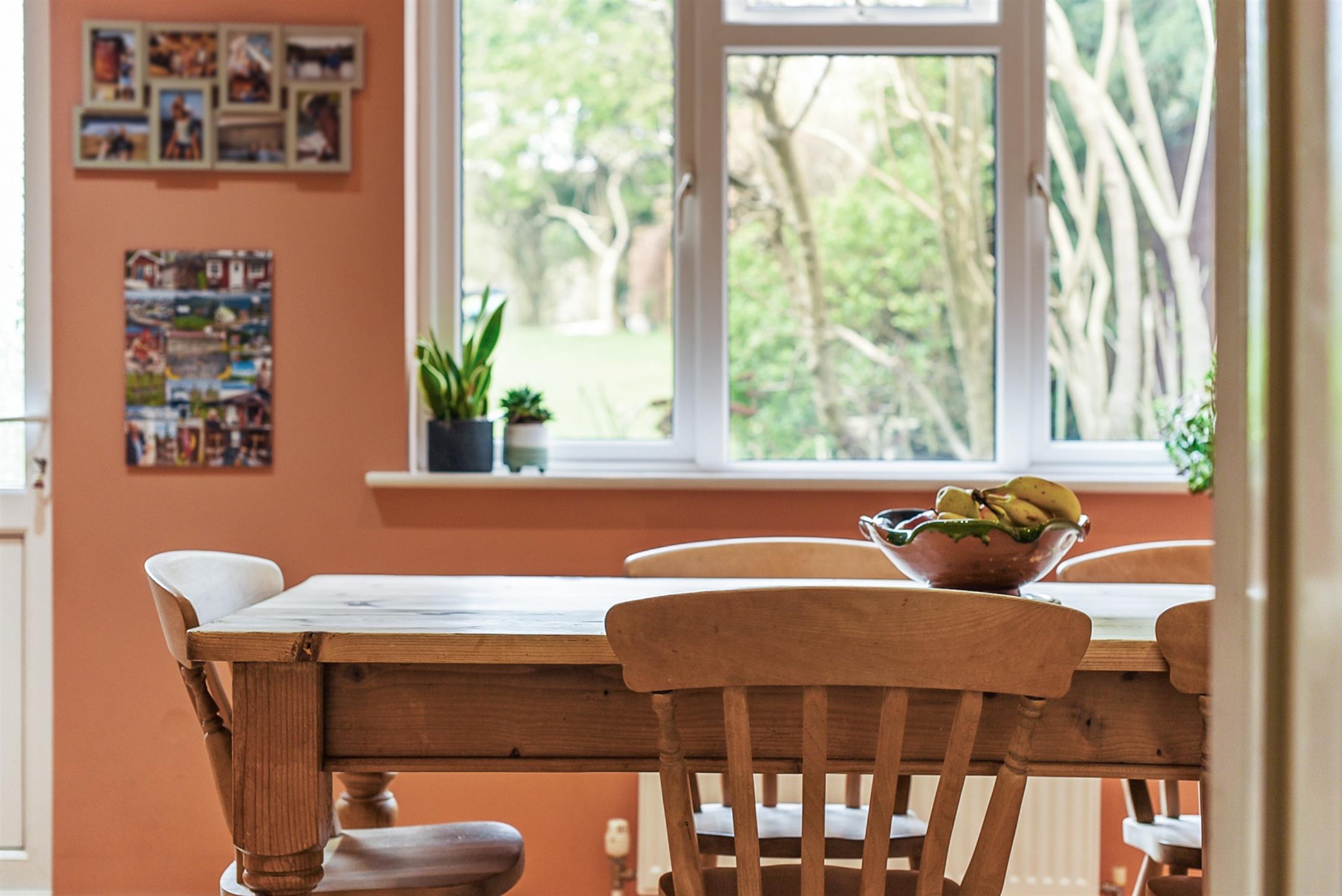The rooms wraps around into a dining area, a versatile space that could serve as a playroom or work from home space. Double doors to patio and garden.