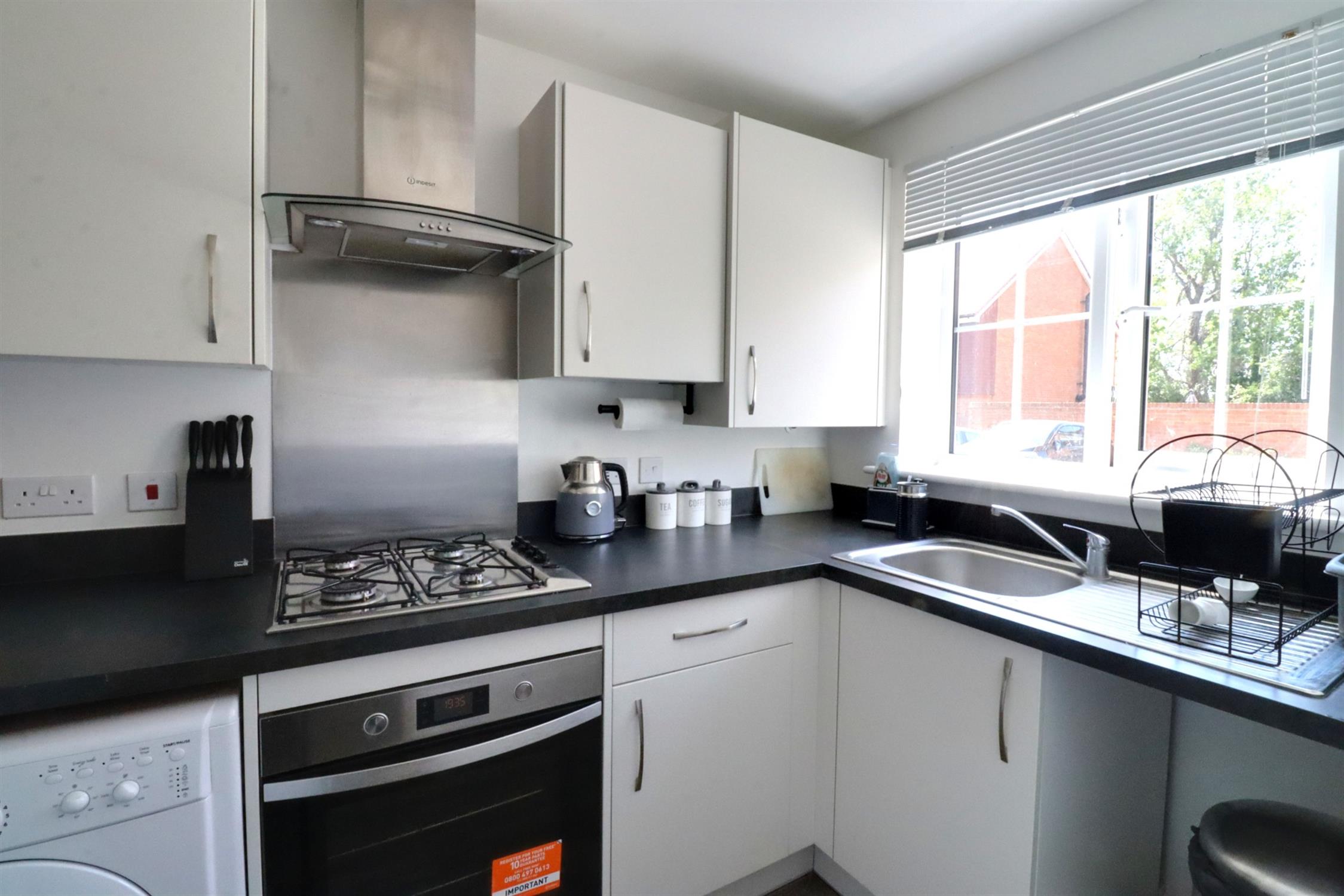 Fitted with a range of modern wall and base units with worksurfaces over, integral electric oven and gas hob with extractor hood over, spaces for washing machine, dishwasher and fridge/freezer, inset stainless steel sink and drainer, front aspect double glazed window.