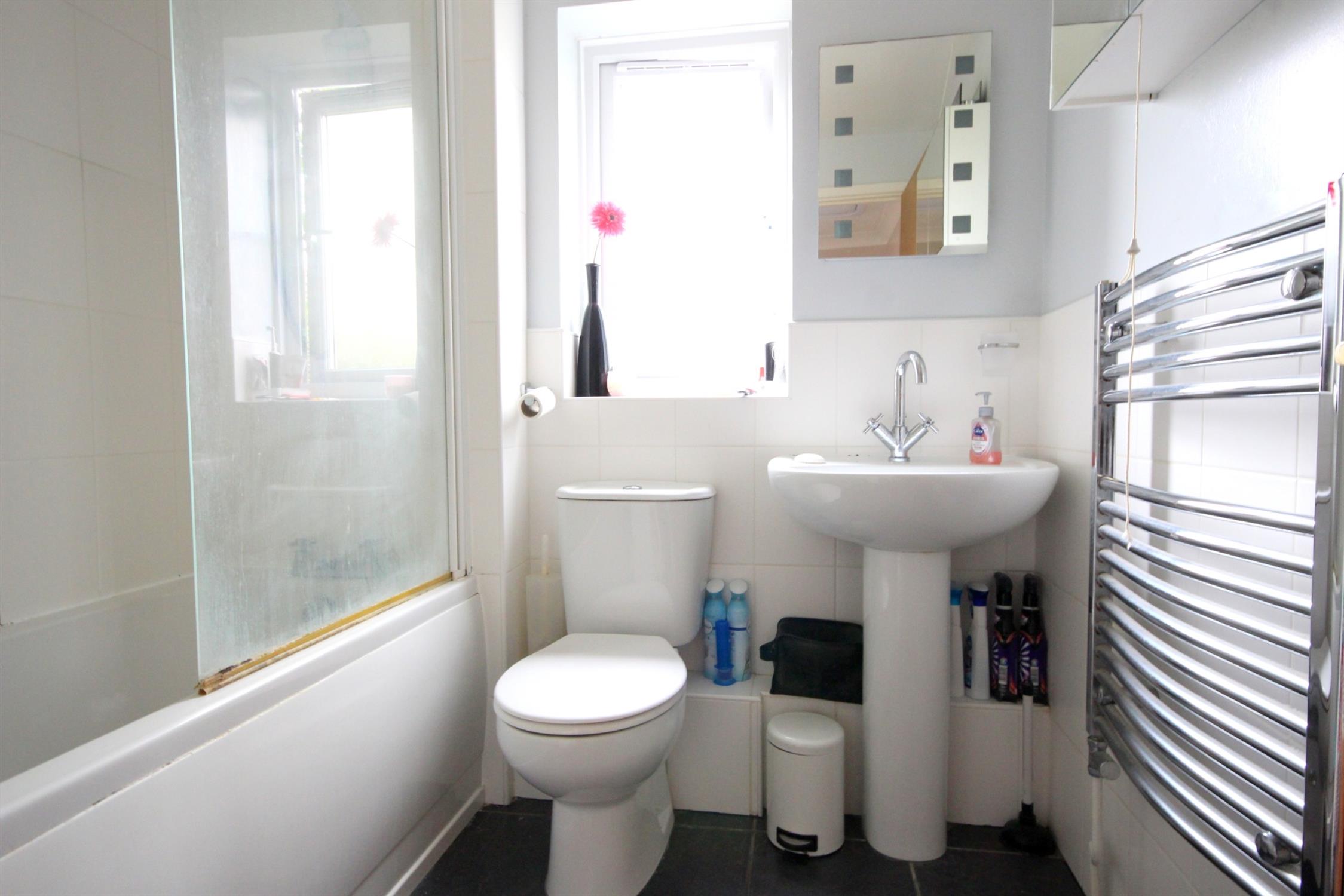 BATHROOM: Modern suite with bath, shower over, basin and toilet.