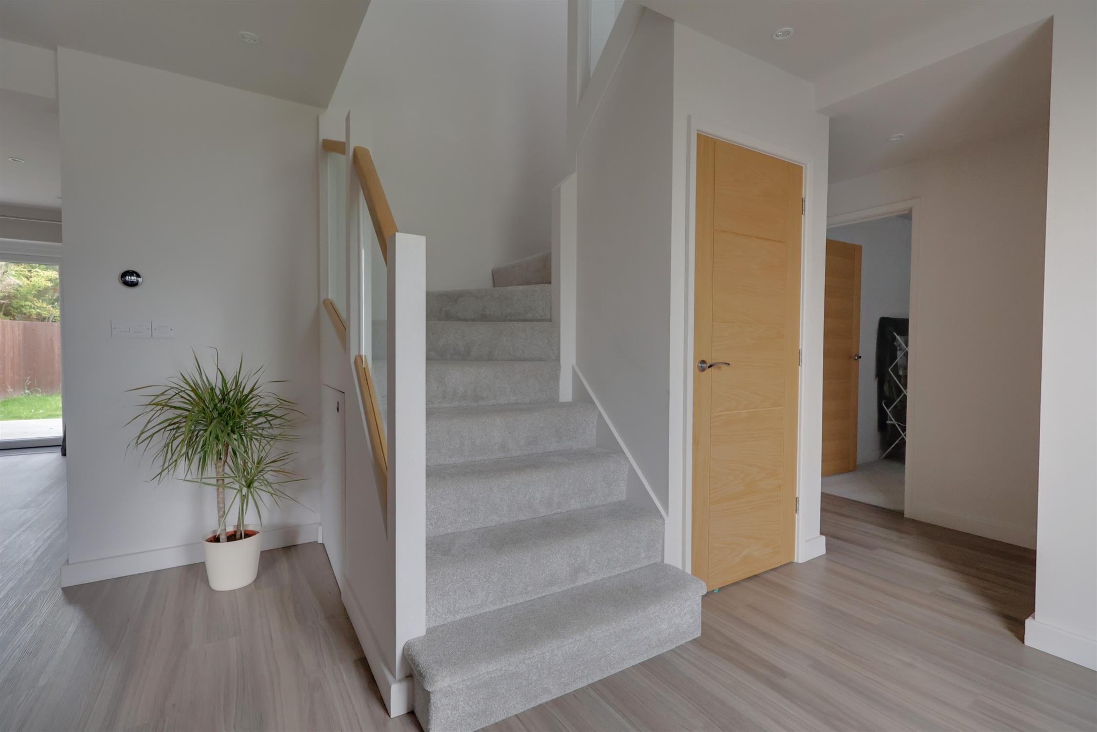 Double glazed entrance door and obscure double glazed flanking window. Radiator. Wood effect flooring. Stairs rising to first floor landing with glazed balustrade. Two under stairs storage cupboards, one housing space and plumbing for automatic washing machine and the other housing space for a tumble dryer.