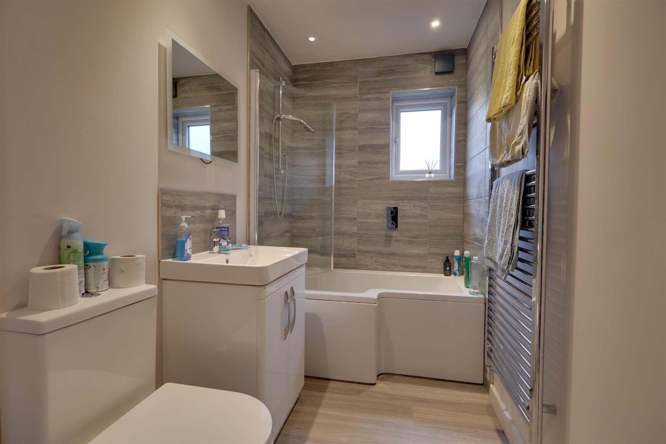 Fitted suite comprising; panelled bath with shower over, vanity hand basin and low level w.c. Built-in airing cupboard and radiator. Chrome finish towel rail/radiator combination finished in a ladder style. Partly tiled wall surfaces. Obscure double glazed windows. Smooth plastered ceiling. Spotlights.