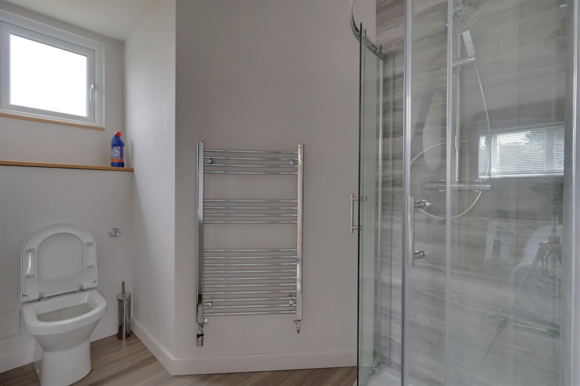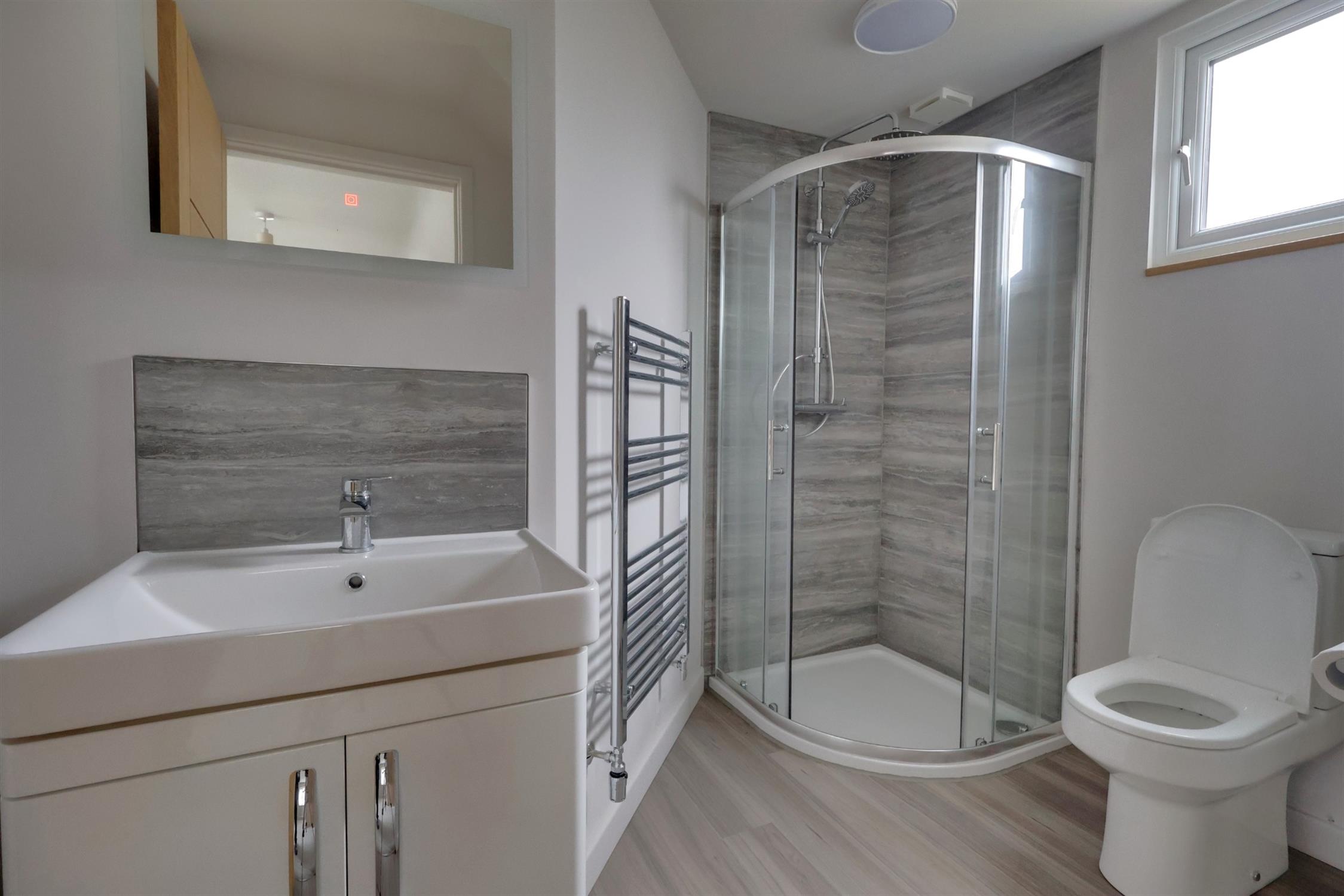Quadrant style shower with rainfall style shower head and body washing attachment, vanity hand basin and low level w.c. Wood effect flooring. Chrome finish towel rail/radiator combination finished in a ladder style. Extractor fan. Smooth plastered ceiling.