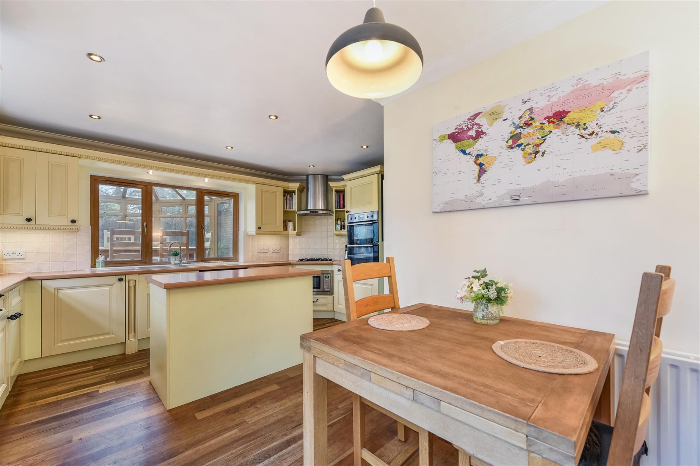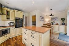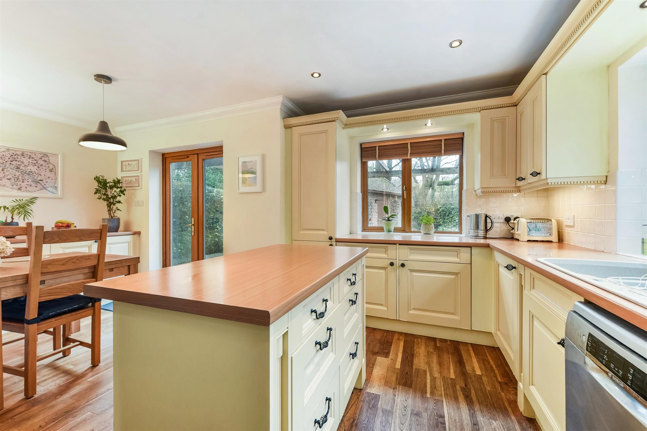 A fully fitted kitchen with space to dine. The kitchen island offers extra storage and worktop space. The integrated fittings and appliances include integrated Neff microwave, oven & grill, four-ring Gas hob, undercounter fridge and freezer and double sink with drainer. Double doors open to the rear garden.