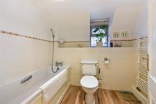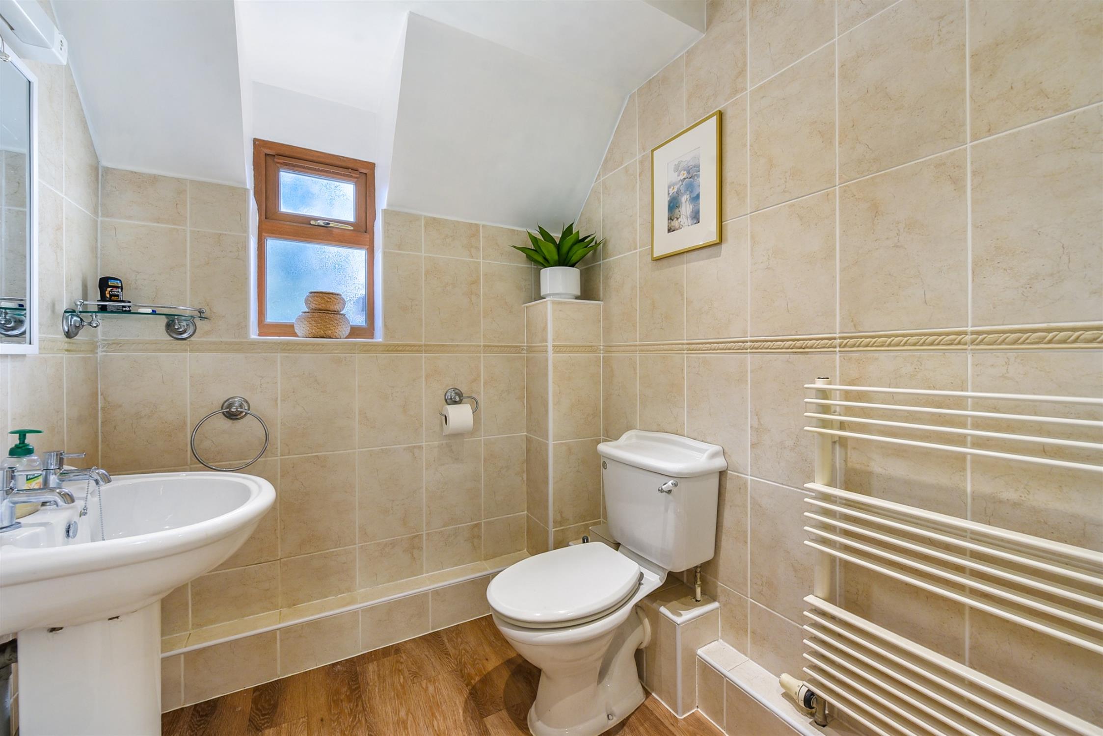 Half-tiled bathroom with bath, toilet, sink and heated towel rail.