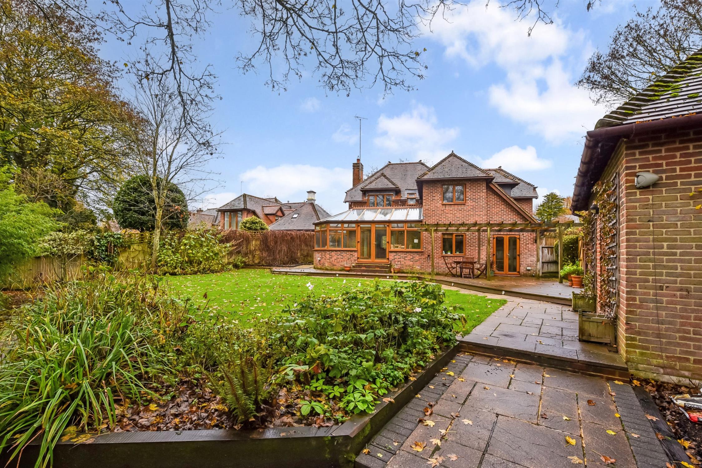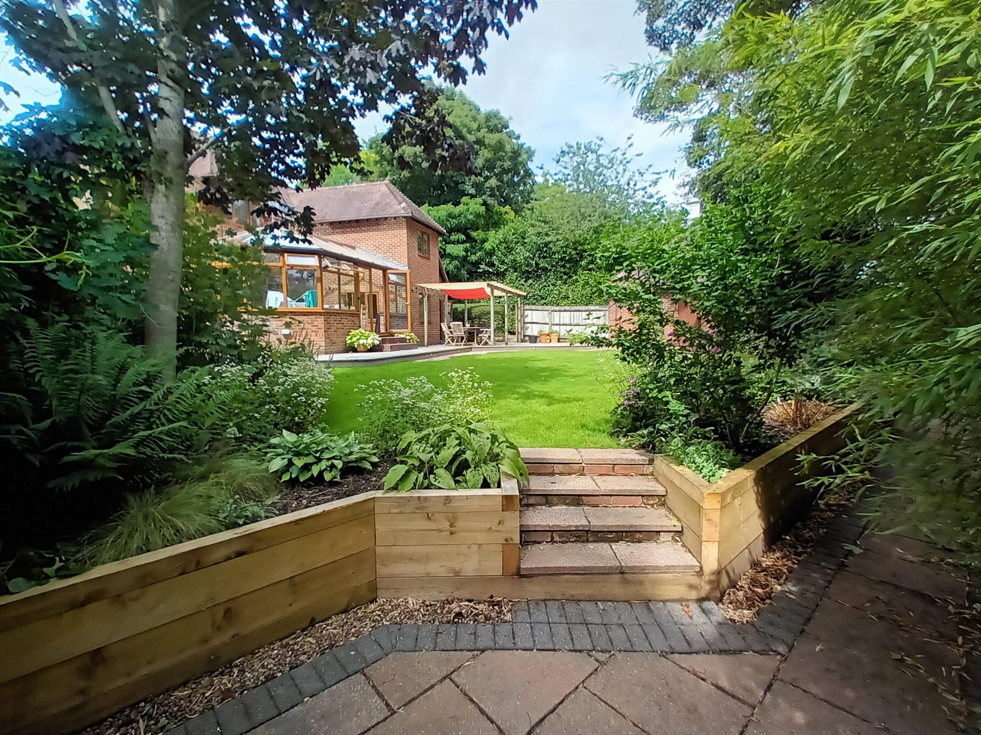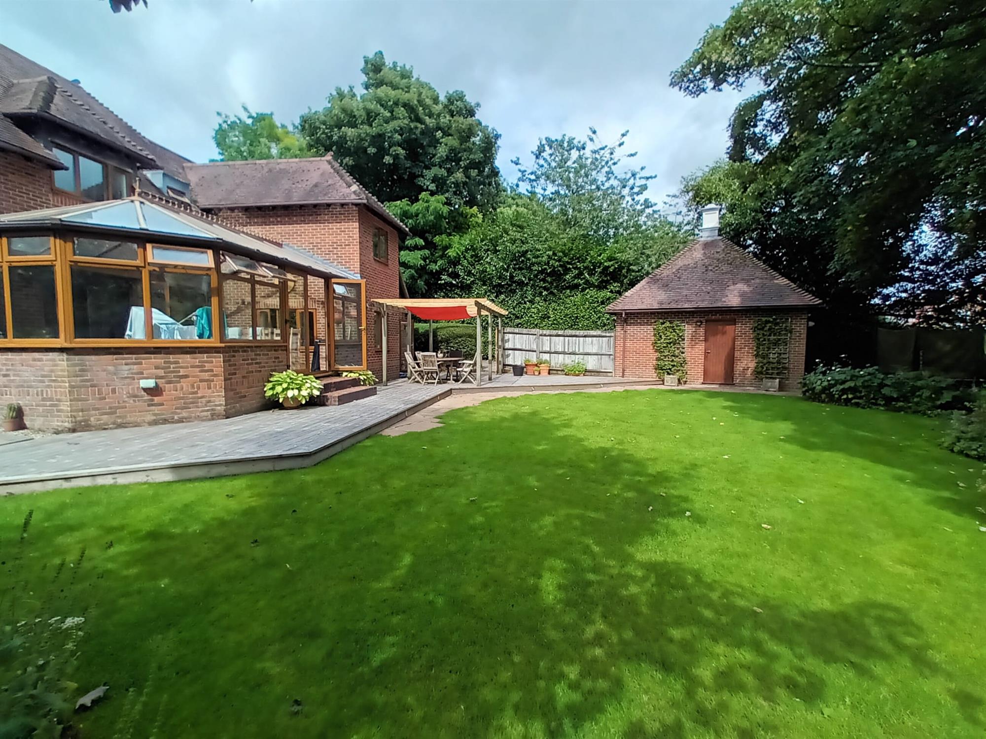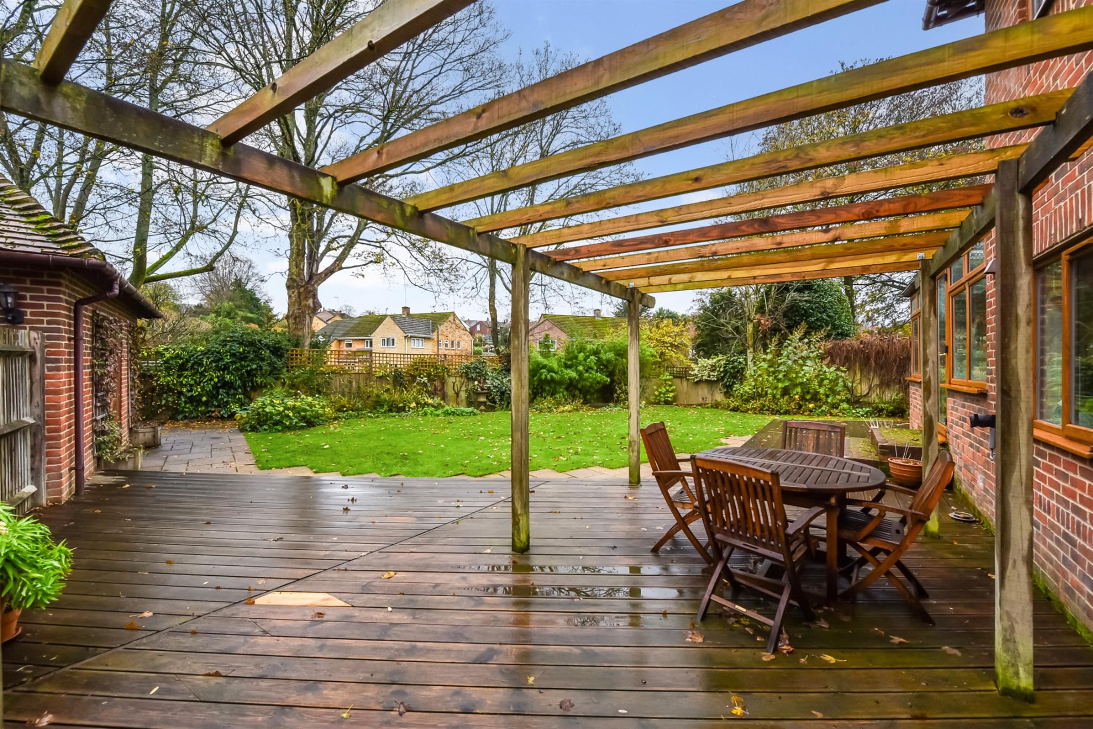 A lovely garden offering a wonderful amount of space. Large decking area with attractive pergola, perfect for entertaining adjacent to the kitchen. The majority is laid to lawn with mature planting and shrubbery bordering. As well as a lower terrace surrounding. The side area to the rear of the garage would make an excellent location for a home office. Side access door to the garage.
