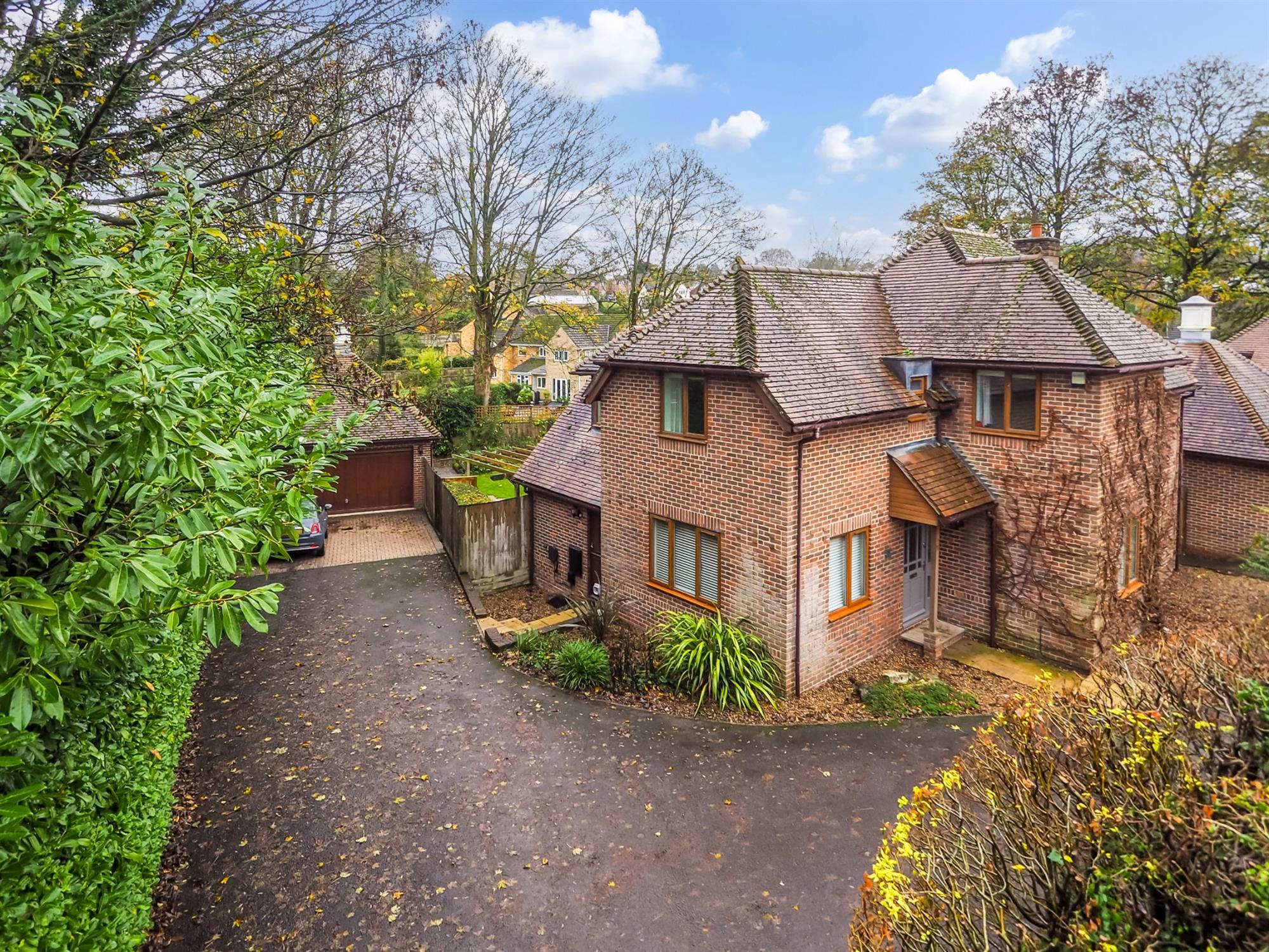 The large driveway offers ample parking for many vehicles and leads to the double garage and side gate to rear garden. There is a fully fitted Hypervolt EV charger. Tended flowerbeds wrap around the house, with a side patio and path to the covered front door.