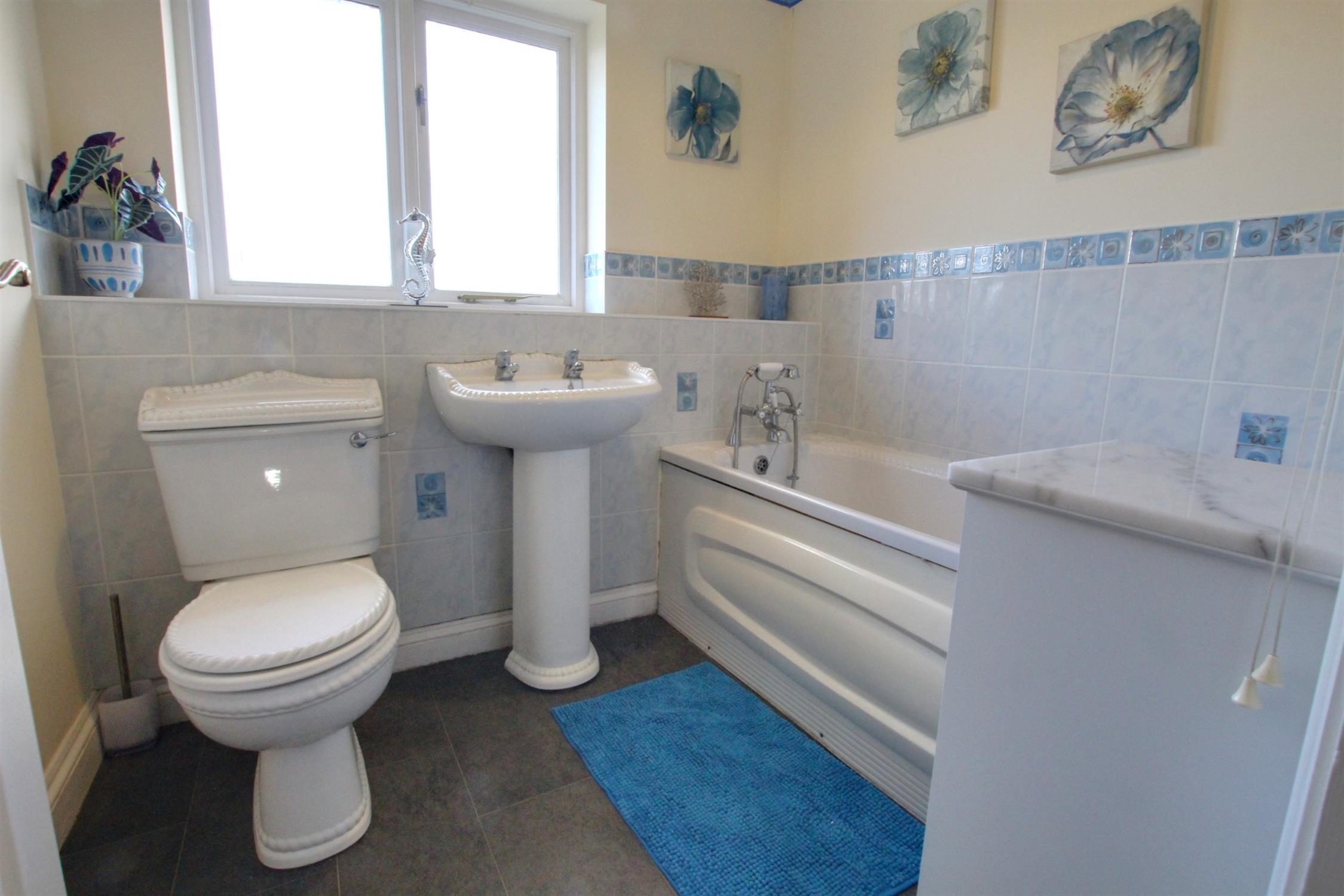 Shower cubicle with glass screen, toilet, port hole window to front aspect, sink with mixer tap and built in storage under, towel rail with radiator under.