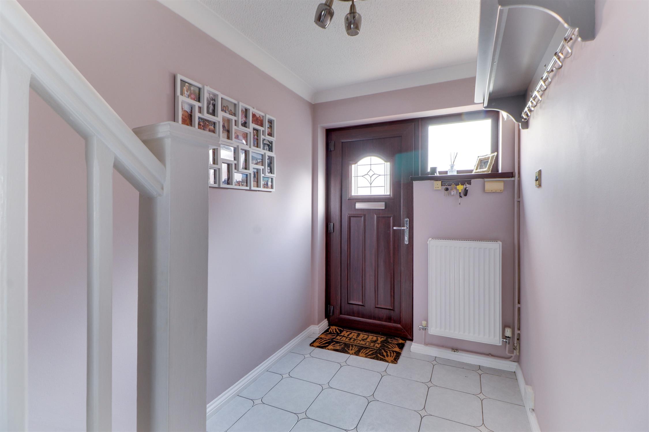 Textured ceiling, coving, coat hooks, UPVC entrance door with obscure glazed panel and matching side window, radiator, stairs rising to first floor, under stairs storage and tiled flooring.