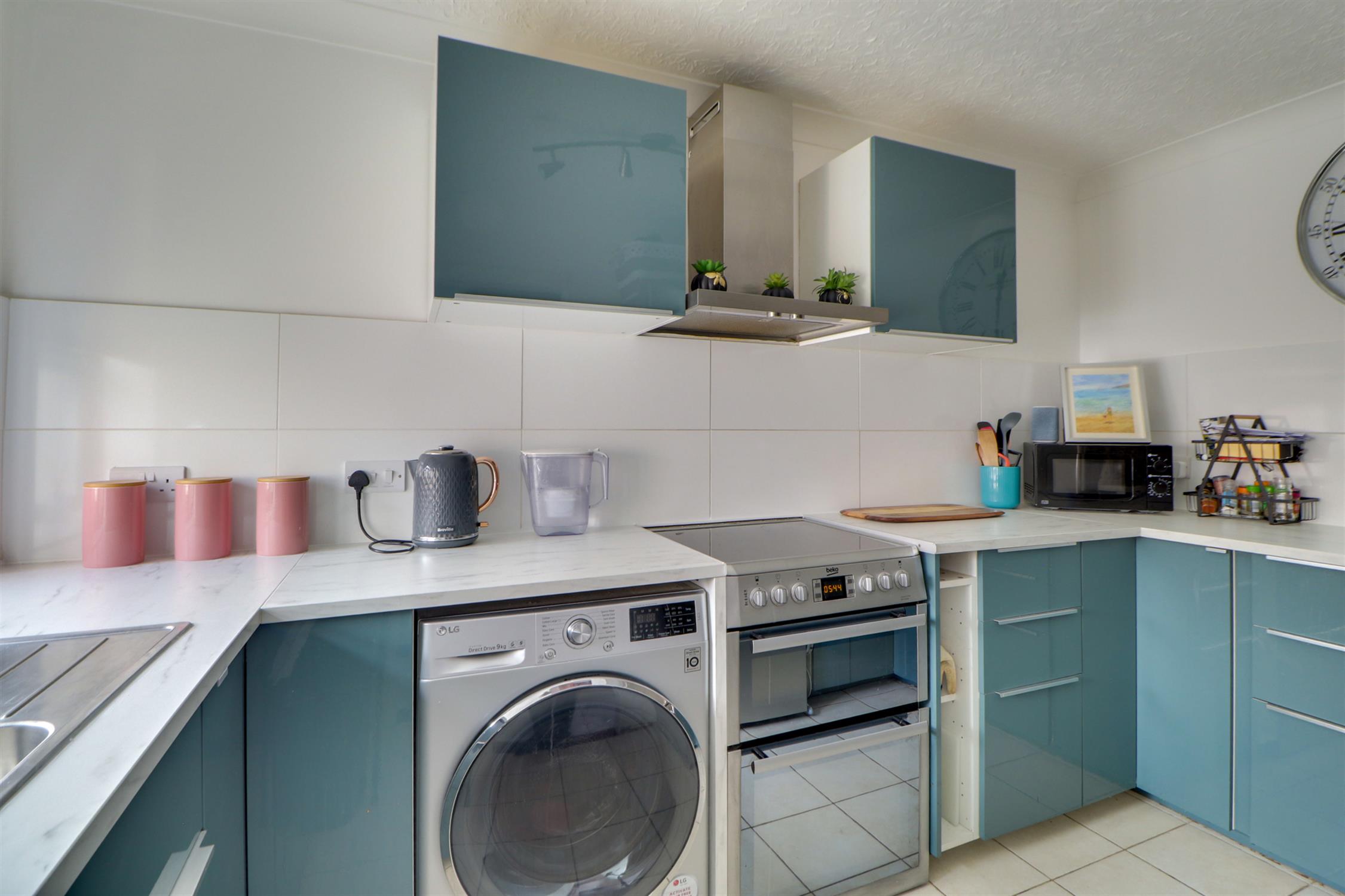 Textured ceiling, UPVC double-glazed ceiling, a range of wall and base-mounted units with work surfaces over, inset stainless steel sink and drainer, tiled splash back, cooker with extractor fan over, space for appliances and tiled flooring.