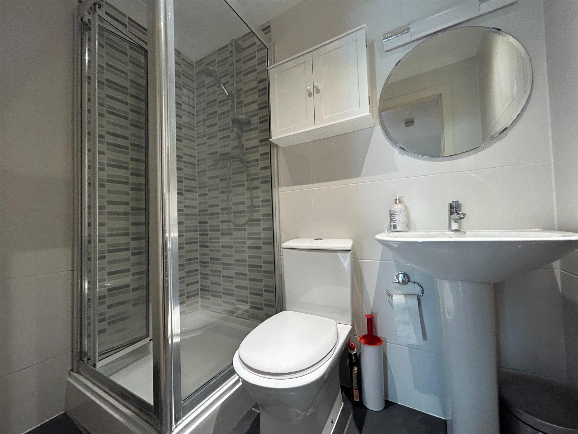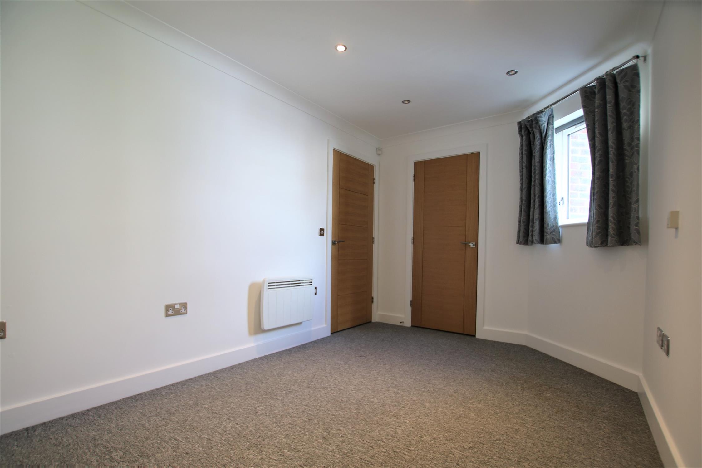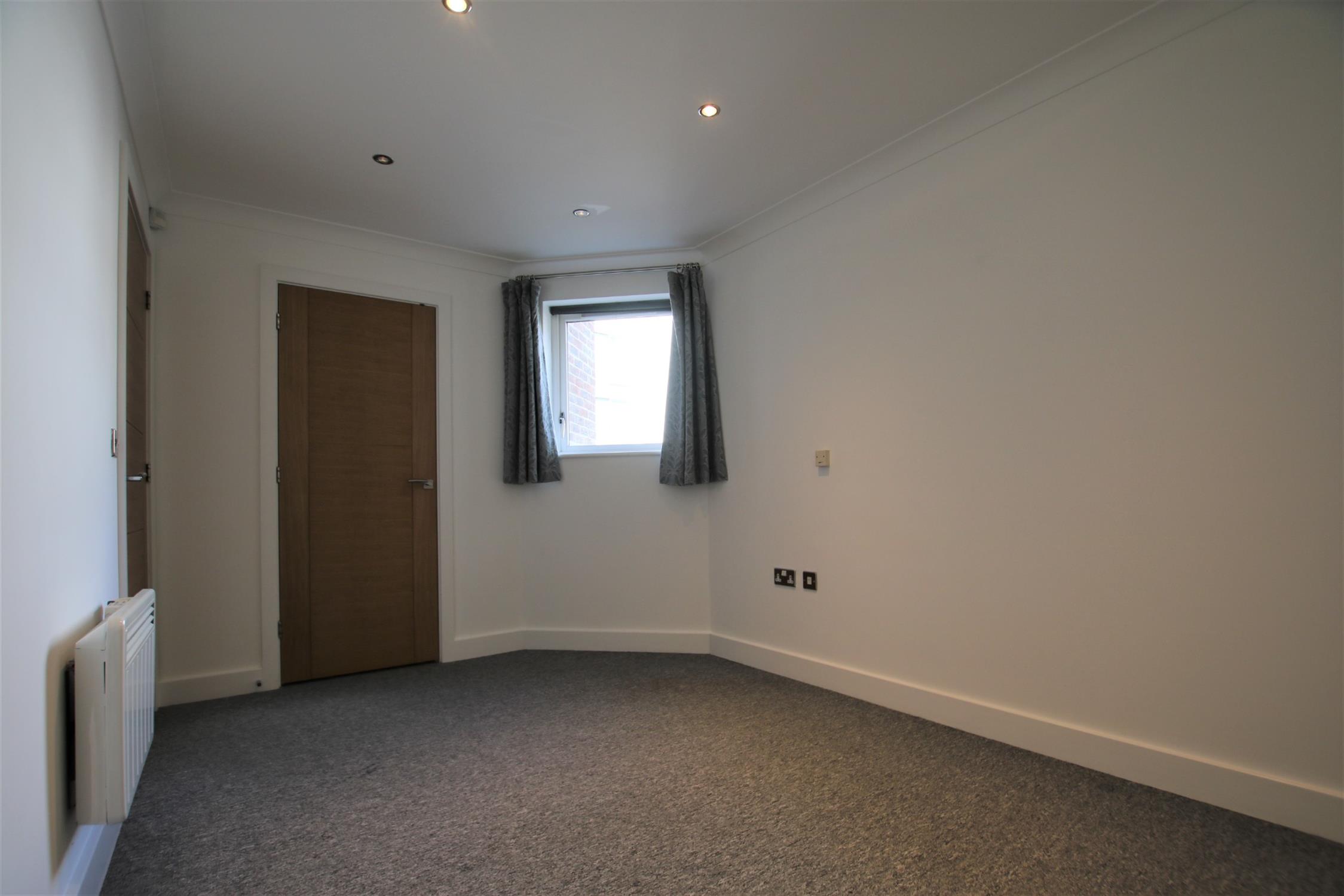Upon entry through the apartment’s front door, there is a spacious vestibule hall which leads through to all accommodation. The bright kitchen/living room is particularly generous in size and dual aspect. There is plenty of space for both lounge and dining furniture and its raised position in the building means it is quiet and private. The kitchen is contemporary in design and is fitted with a range of eye and low-level units with integrated appliances including hob, oven, and fridge/freezer. The bedroom is a good size double and further benefits from a sizeable built-in wardrobe. The bathroom is a white suite and is fitted with shower, handbasin, toilet and chrome heated towel rail. Finishing off the apartment is a further storage cupboard in the hall.