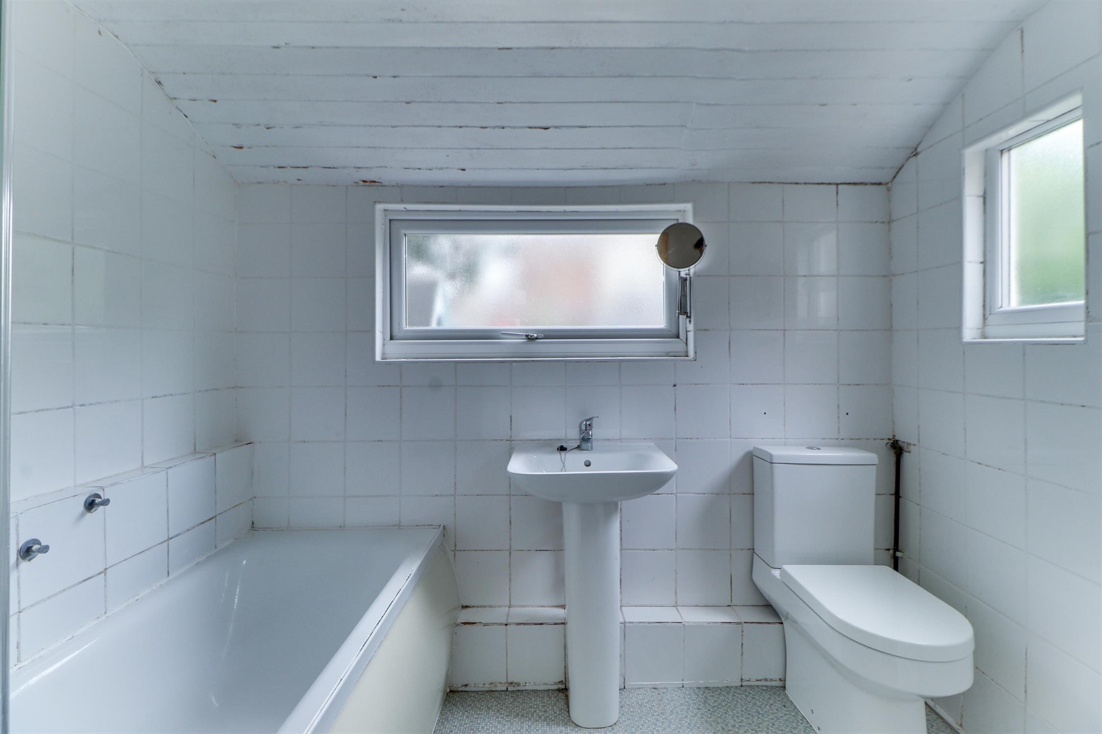 Wooden panelled ceiling, UPVC double-glazed windows, bath with shower over, ladder towel radiator, wash hand basin, low level W.C and vinyl flooring.