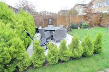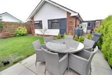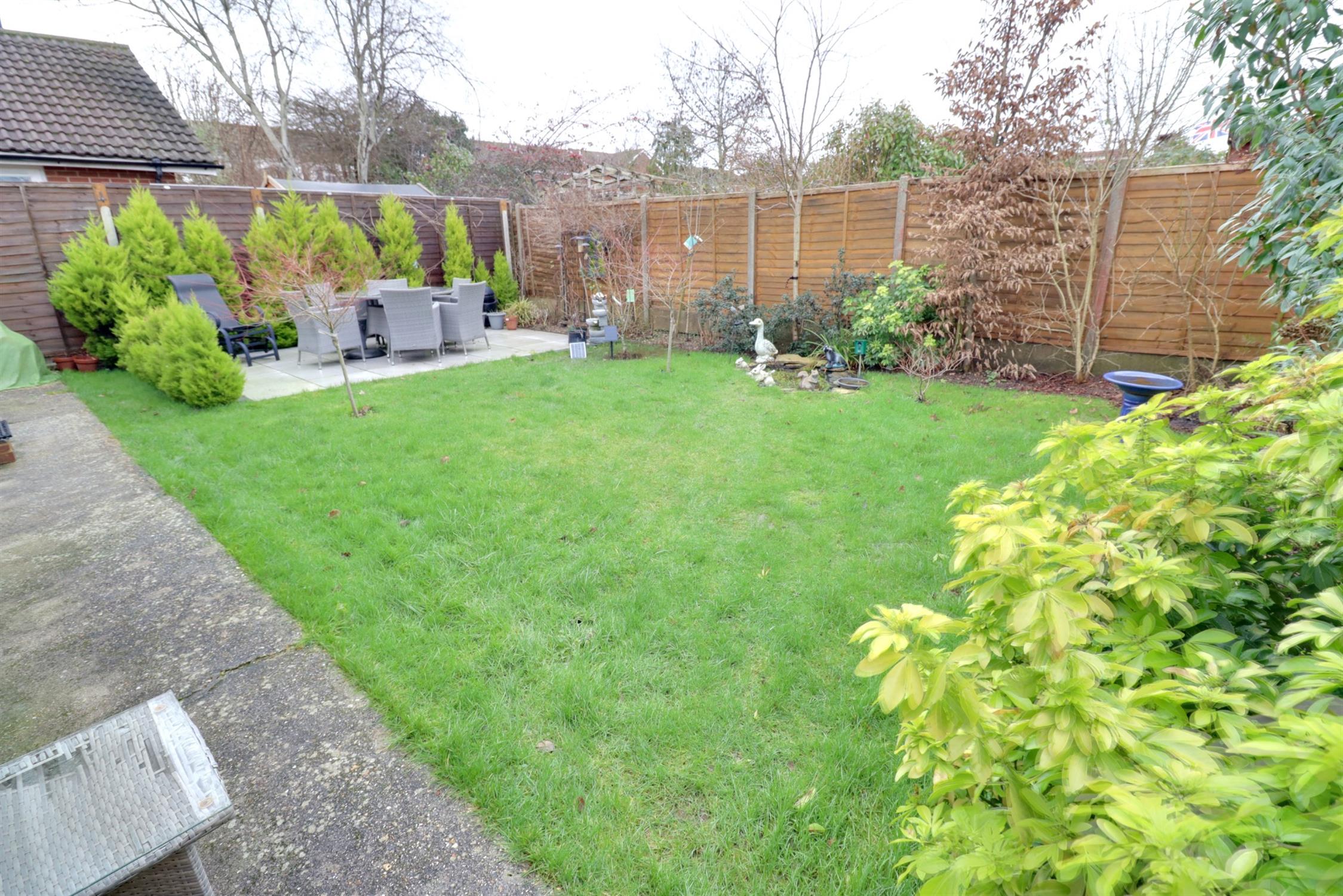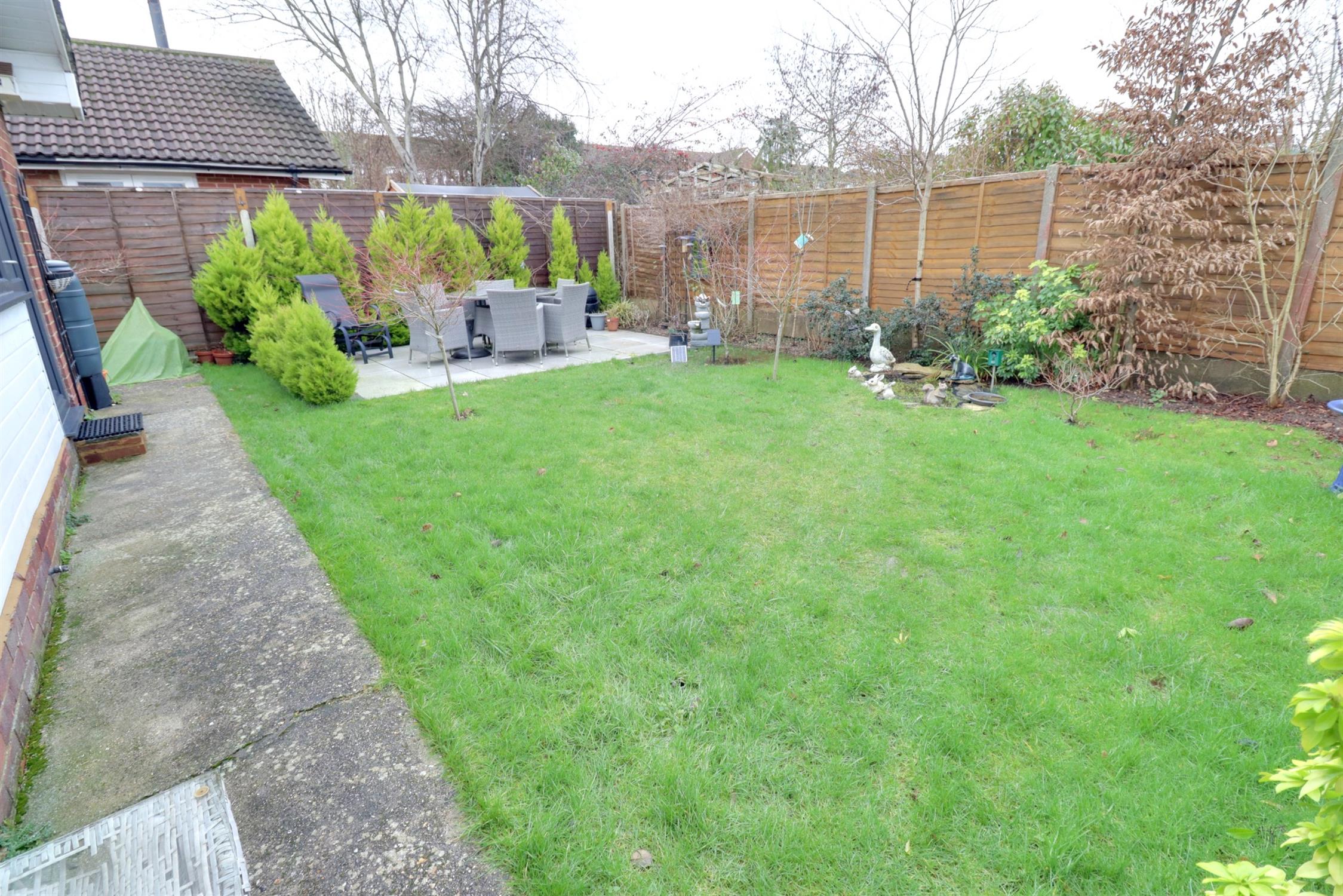 Timber fence panel enclosed, lawned area, paved patio/seating area, external courtesy lights.