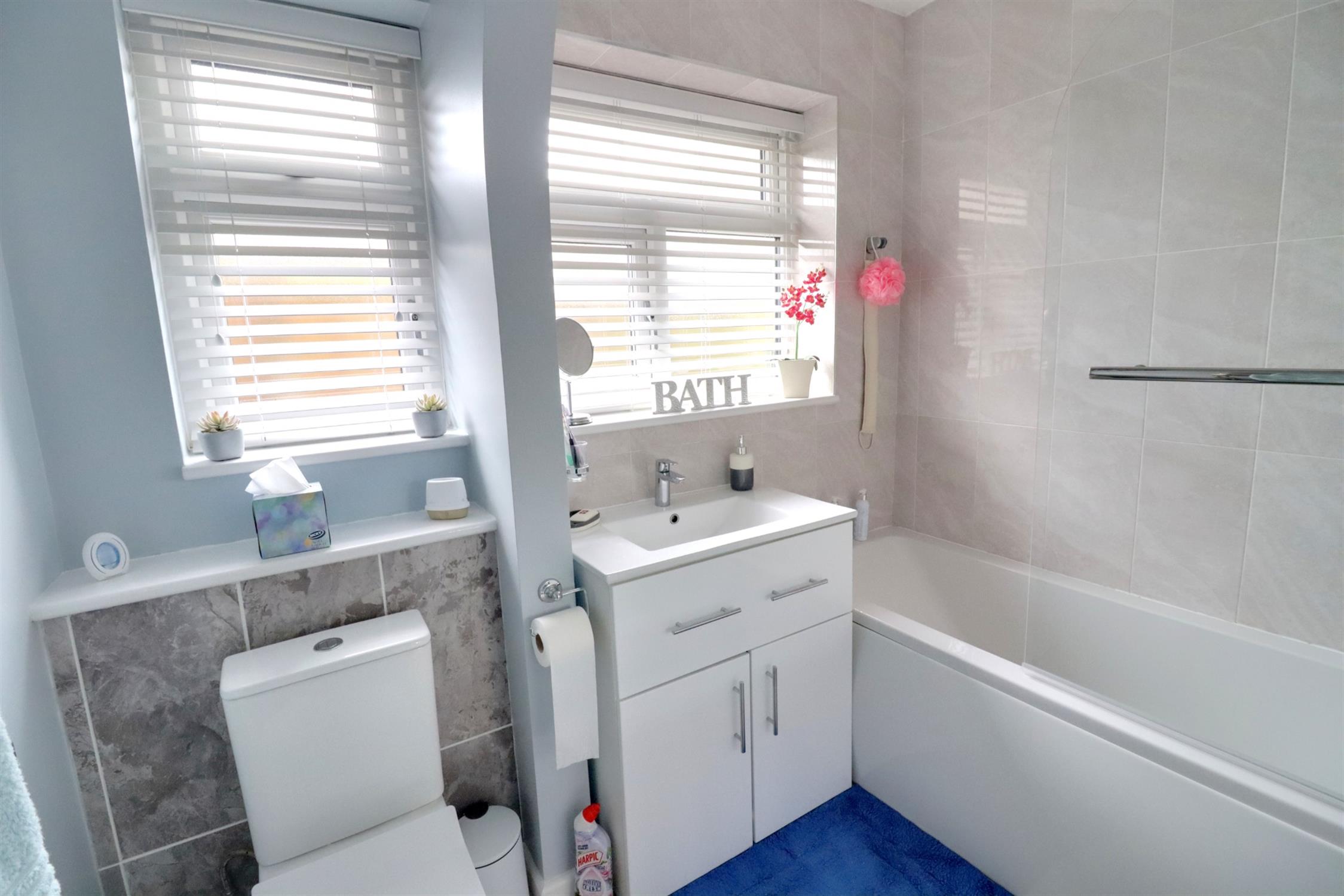 Two opaque double glazed windows to side, matching suite comprising: panel enclosed bath with rainfall shower head and hand-held shower attachment, shower screen, WC, hand basin with mixer tap, vanity storage cupboard, ladder-style towel radiator, laminate flooring.