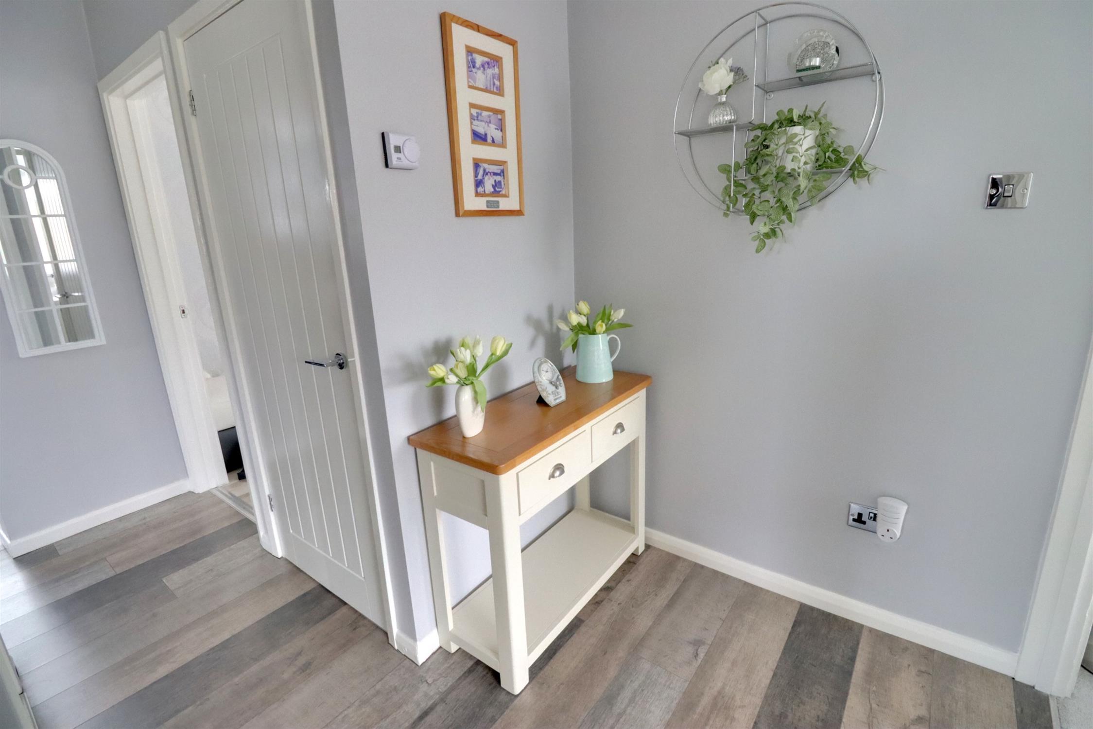 Lead light opaque double glazed front door, radiator, shelved storage cupboard, slatted shelved airing cupboard, laminate flooring, access to insulated and boarded loft via pull-down loft ladder.