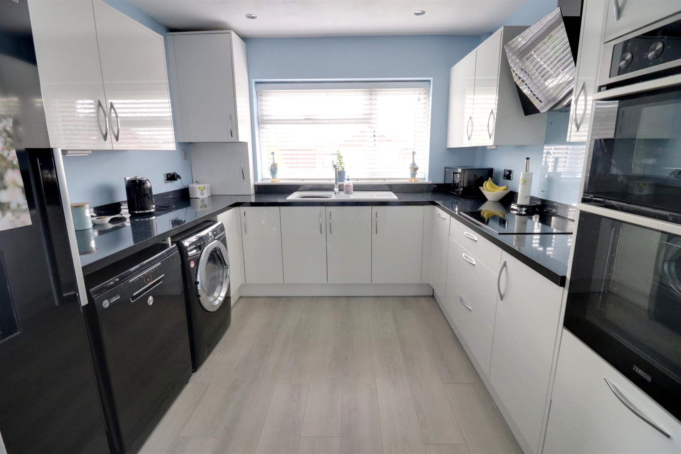Double glazed window to front aspect, modern range of fitted wall and base units, worktops, inset one-and-a-half bowl single drainer sink with mixer tap, induction hob with overhead extractor, electric oven and grill, space for tall fridge/freezer, dishwasher, plumbing and space for washing machine, wall mounted combination boiler.