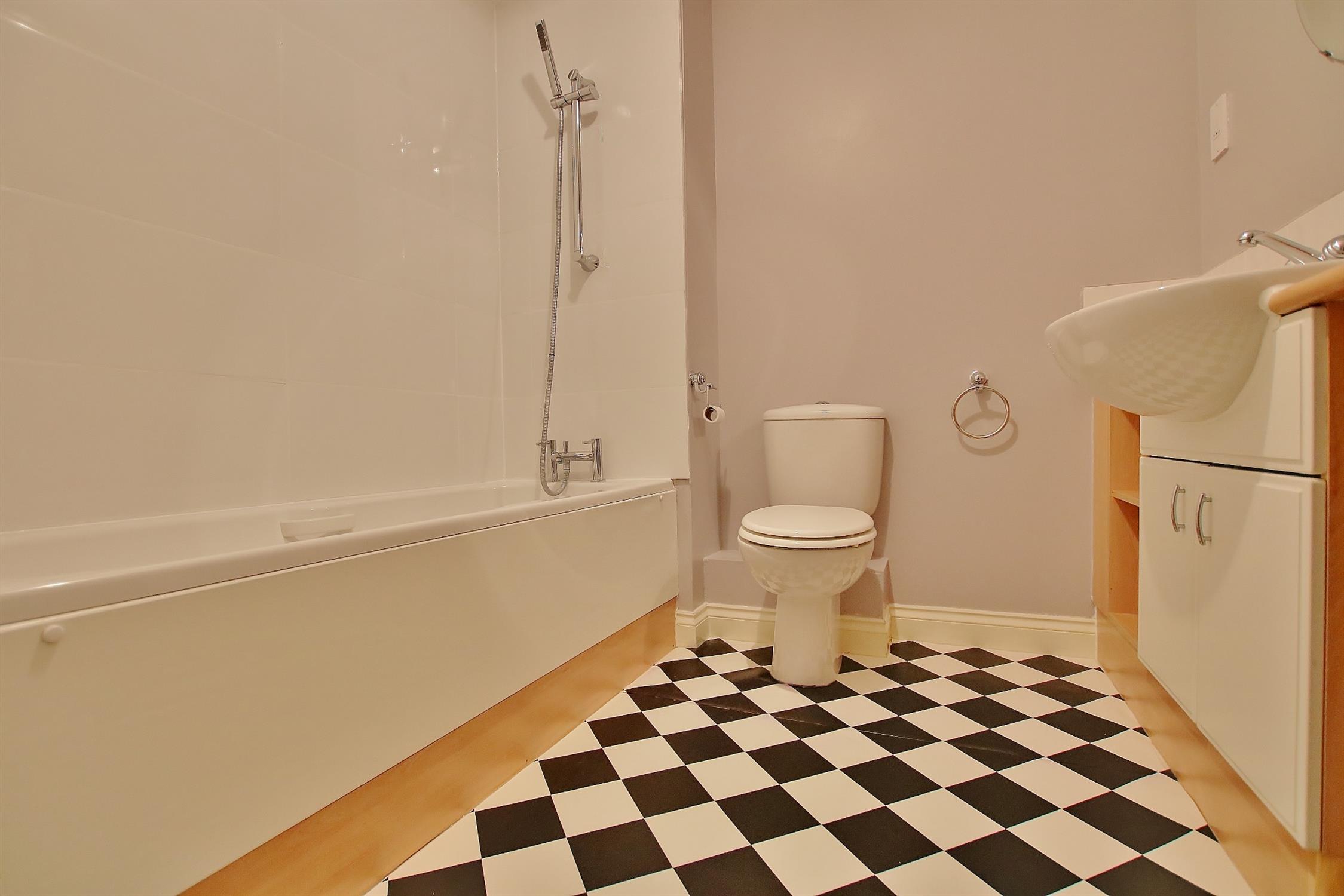 -Bathroom: Spacious room with black and white patterned vinyl. Bath panel, white ceramic washbasin, toilet, wall mounted towel ring and a mirror.