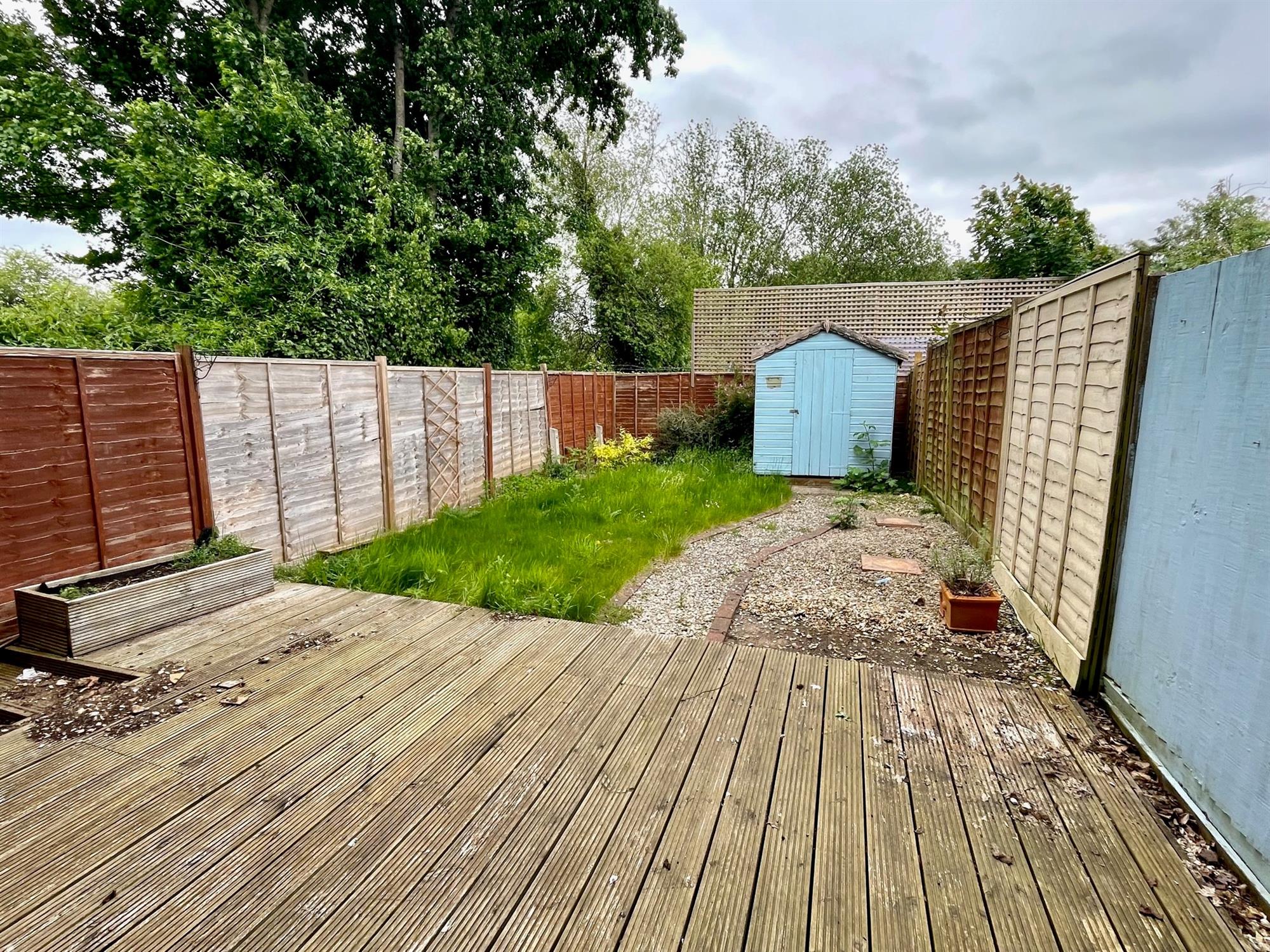 The garden is nicely landscaped, with decking, path and lawn, as well as a garden shed.
