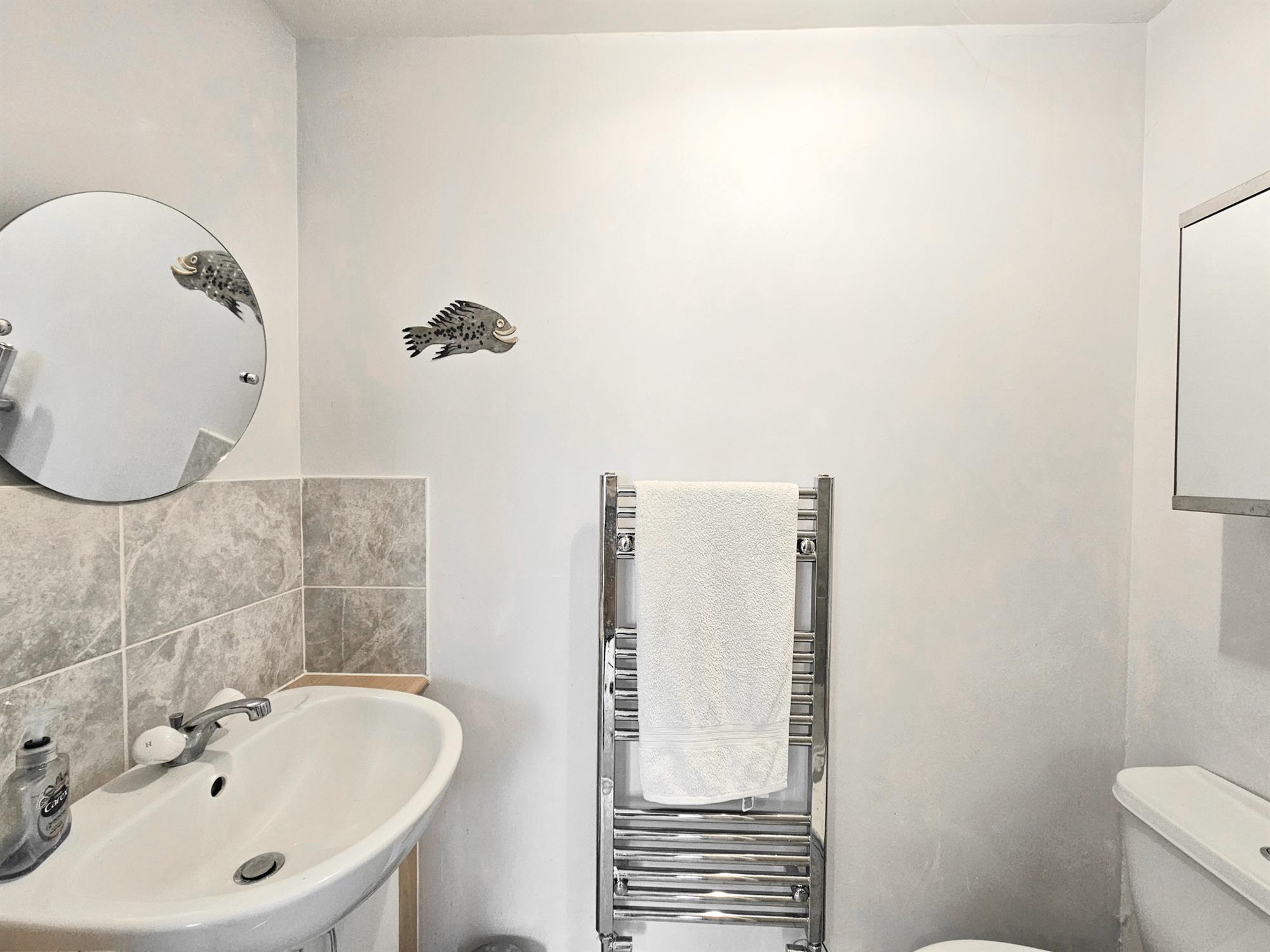 Fitted pedestal sink with splash back tiling. WC. Vinyl flooring. Radiator. Double glazed window to the front aspect.