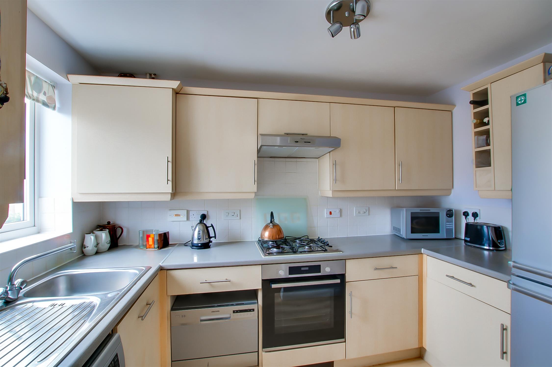 Fitted with a range of units incorporating wall, drawer and base units with complimentary worktops and tiling. Gas hob with extractor over and Bosch electric oven. Stainless steel sink unit and drainer with mixer tap over. Tiled splashback. Space for a dishwasher, washing machine and fridge/freezer. Cupboard housing a Baxi 400 boiler. Extractor fan. Vinyl flooring. Double glazed window to the front aspect.