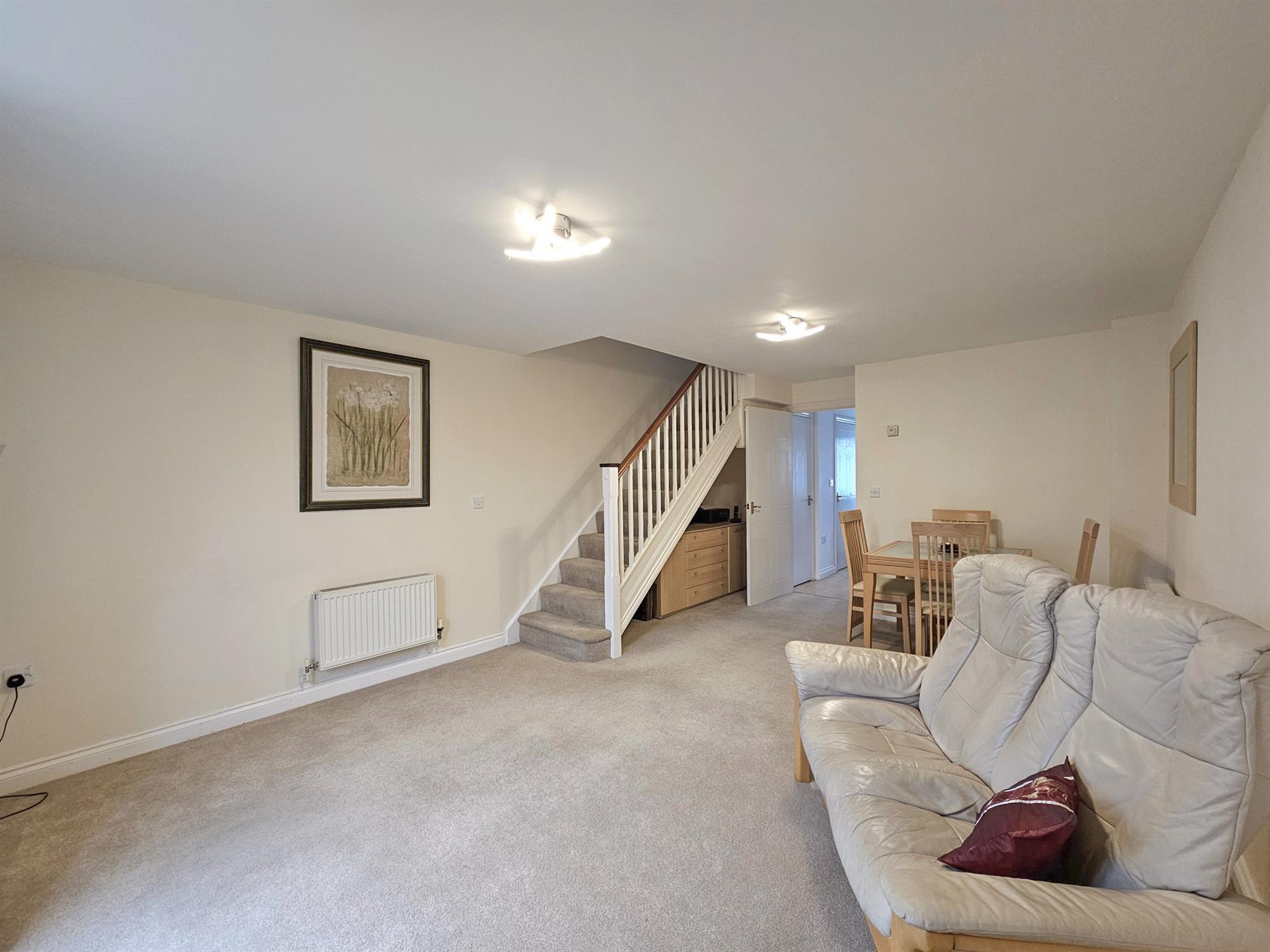 A comfortable open plan sitting/ dining room with staircase leading to the first floor. Space for a dining table and chairs. Additional under-stairs storage area. Two radiators. Double glazed window and french doors opening out on to the patio area and enclosed rear garden.