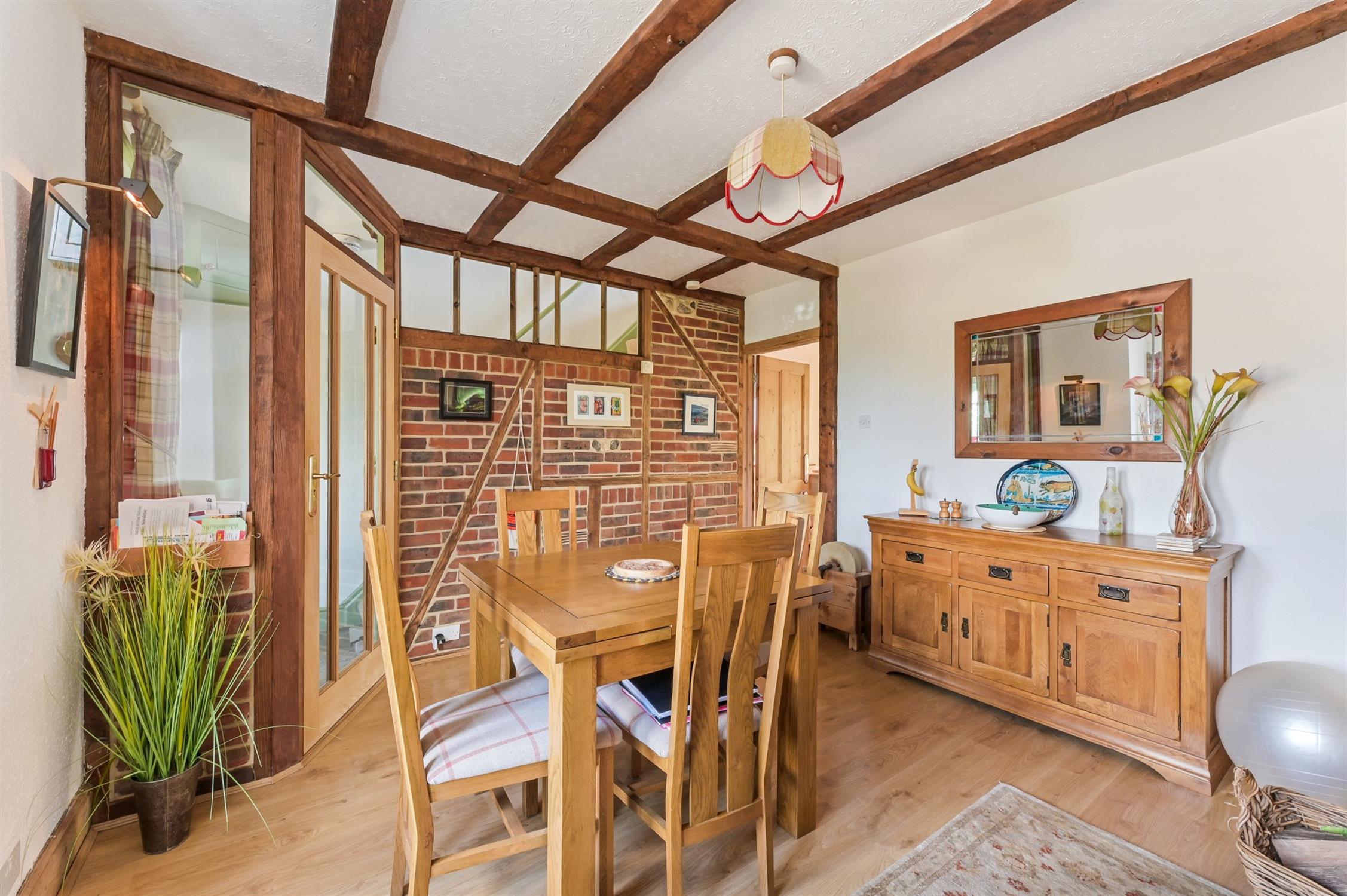 Impressive and well proportioned room with a feature exposed brick wall with inset beams, open fireplace with fireplace surround and grate. Double glazed window to the side aspect and double glazed sliding patio doors, overlooking and leading into the garden room. Beamed ceiling. Radiators. Door to: