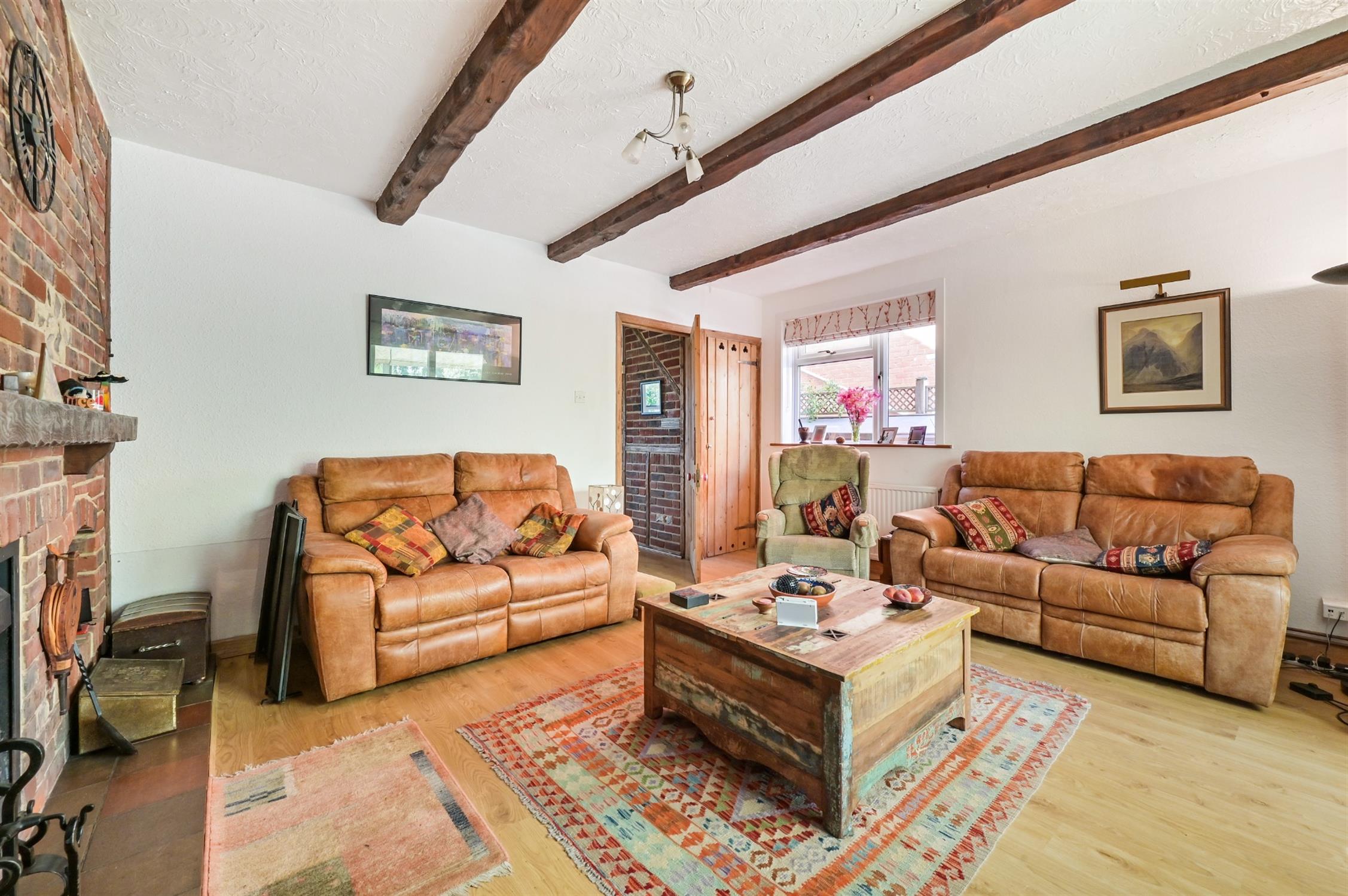 Attractive feature exposed brick and beamed wall. Exposed brick chimney with fireplace recess and fitted wood burning stove. Bespoke fitted alcove shelving and storage on both sides of the fireplace. Beamed ceiling. Radiator. Double glazed sash style windows to the front aspect. Door to:
