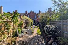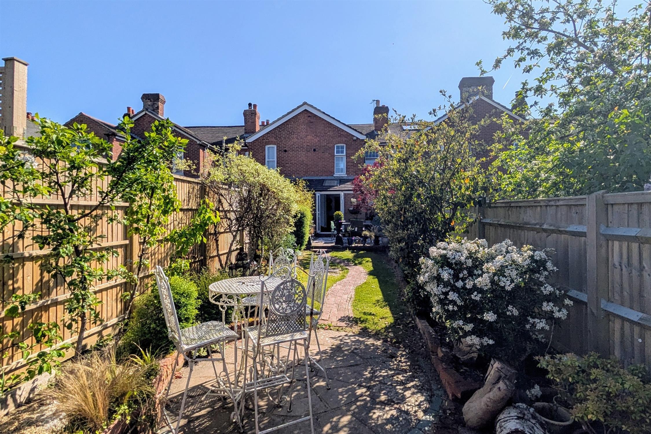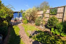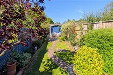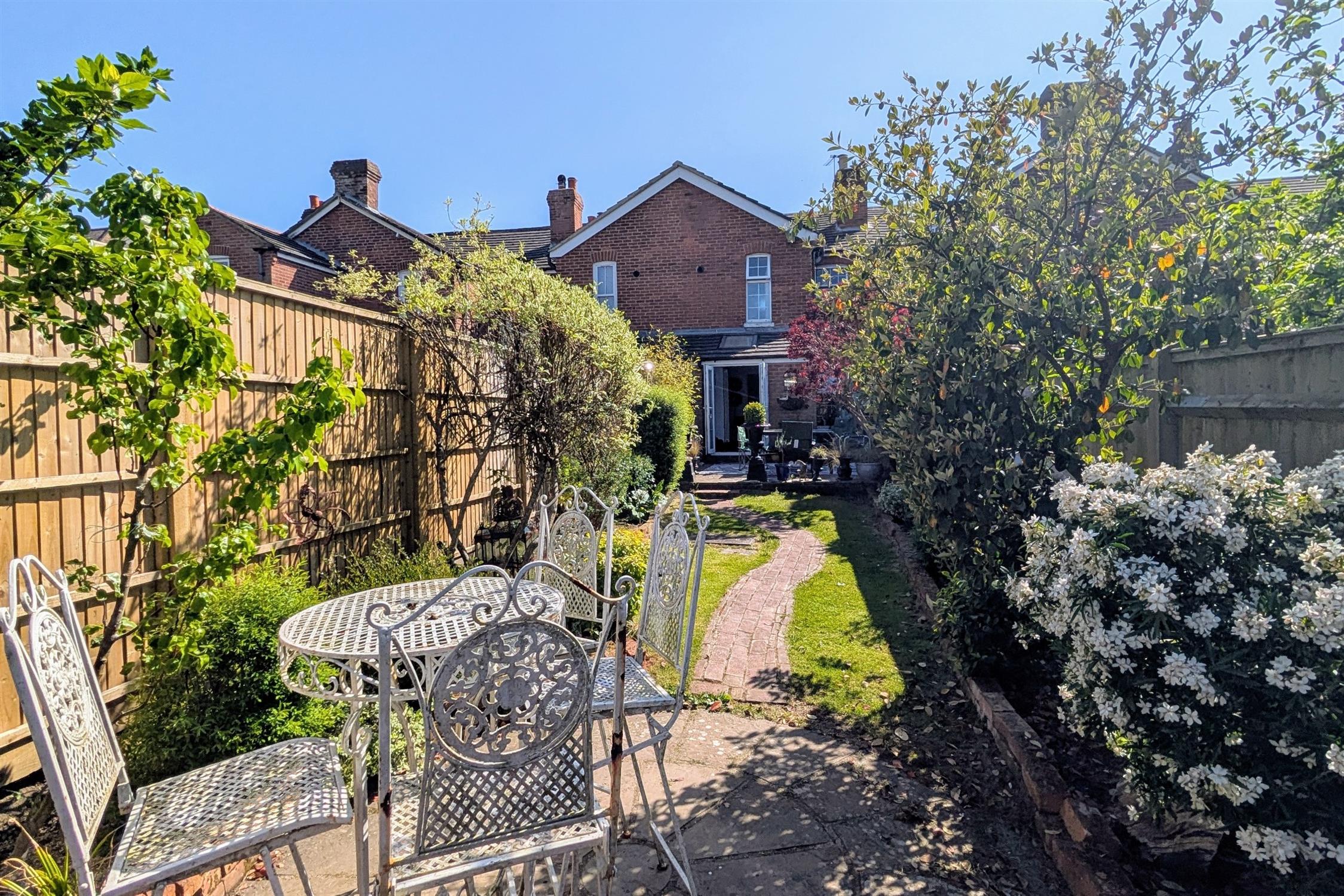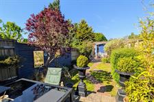 The attractive rear garden has a patio area adjacent to the house. A brick path leads down the garden with well-kept lawns to either side and flower and shrub borders. The path leads to a further patio area and log store. That path continues past the GARAGE and has gated rear pedestrian access which leads to a parking area suitable for two vehicles.