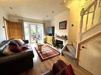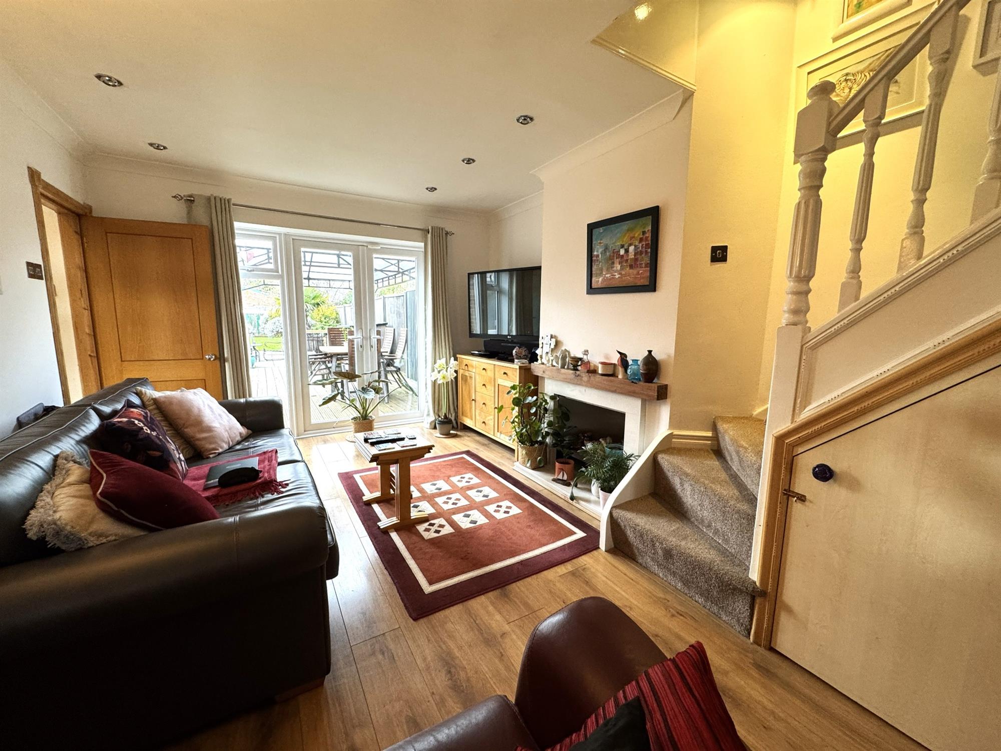uPVC double glazed window and patio door to rear garden, feature gas fireplace, understairs storage cupboard, radiator, smooth finish to ceiling with spotlights and coving, door to kitchen, opening to dining room and stairs to landing