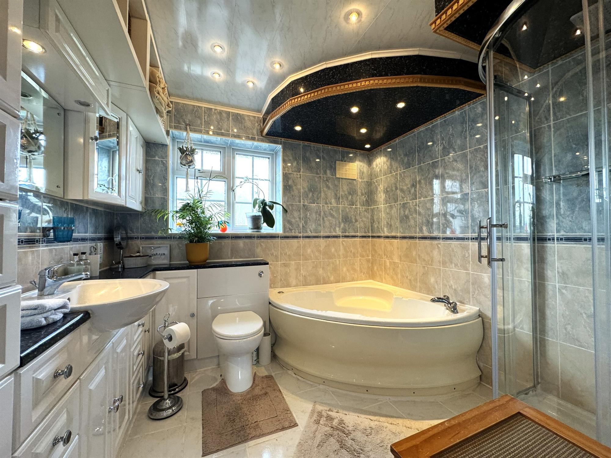 uPVC double glazed window to rear aspect, jacuzzi bath, separate shower cubical with dual attachment, hand wash basin, low level toilet, built in storage units, tiled floor to ceiling, heated towel rail, panelling to ceiling with spotlights