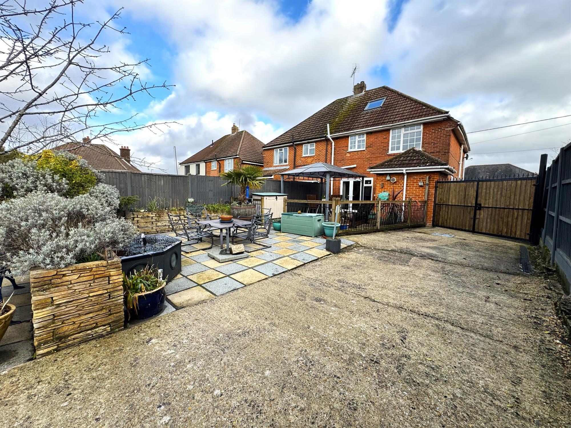 Brick walled enclosed frontage, block pave driveway for multiple cars leading to front door and side gates for rear access