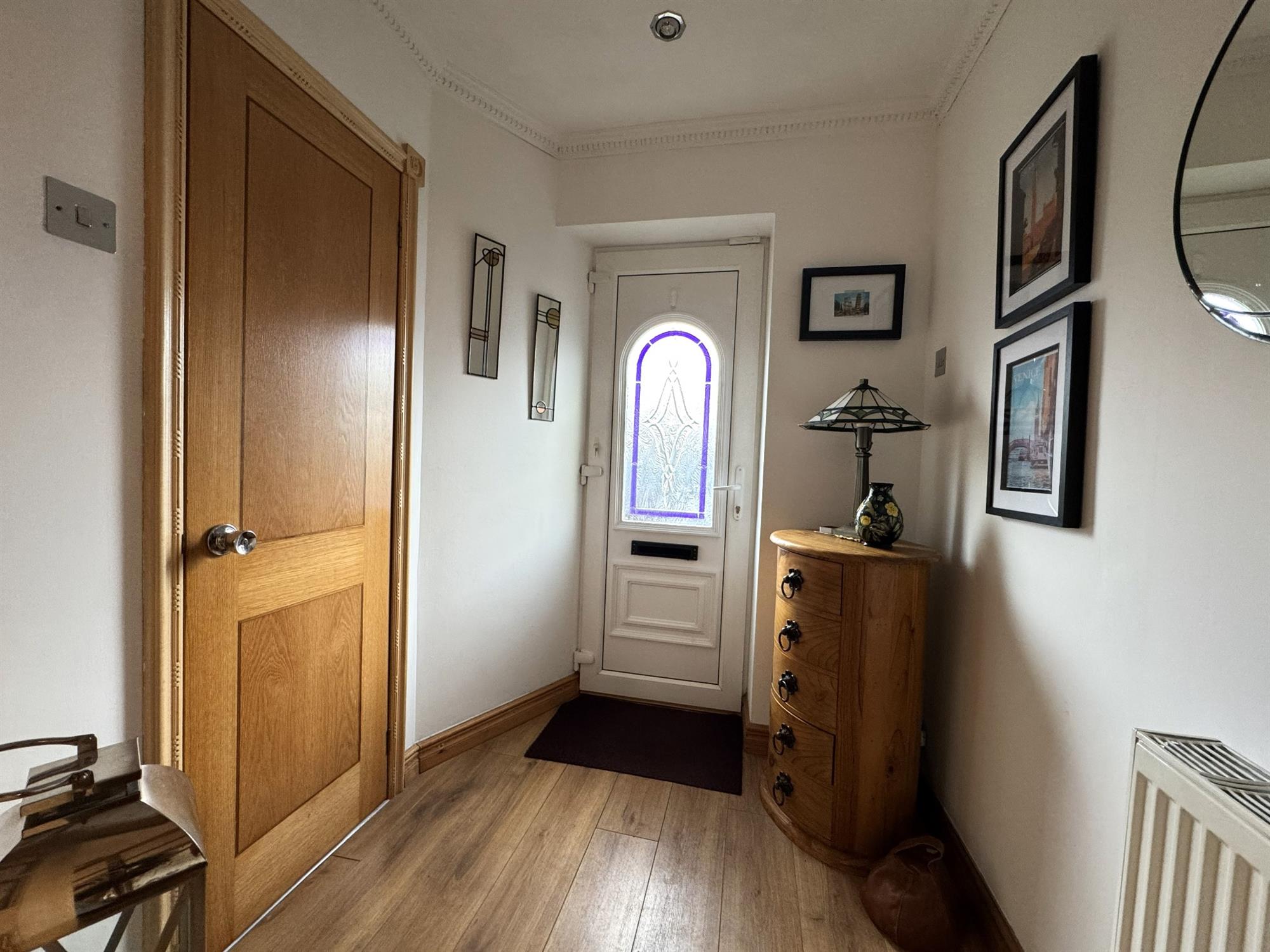 HallwayRadiator, smooth finish to ceiling with spotlights and coving, door to WC and double doors to lounge