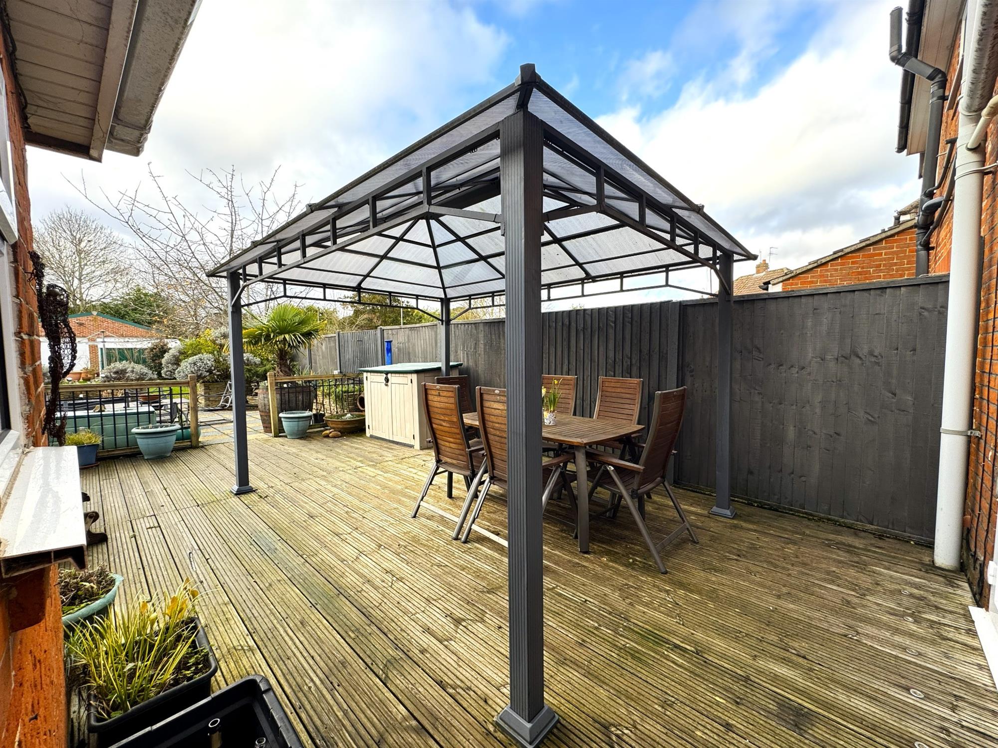 Wooden decking area, block paved patio area with fish ponds and flowerbeds, laid to lawn with trees and shrubbery, shed, greenhouse, paved path leading to double garage at rear