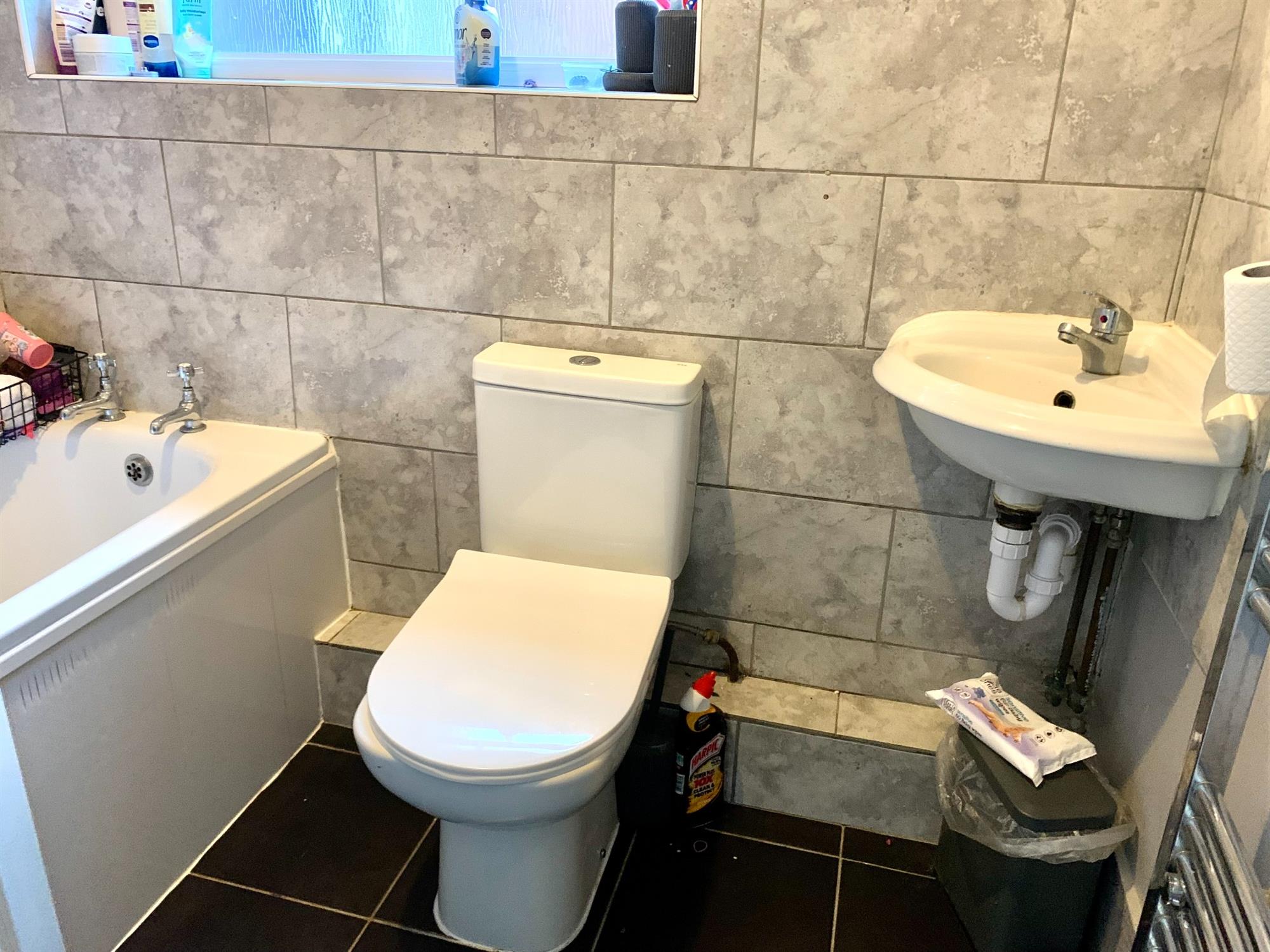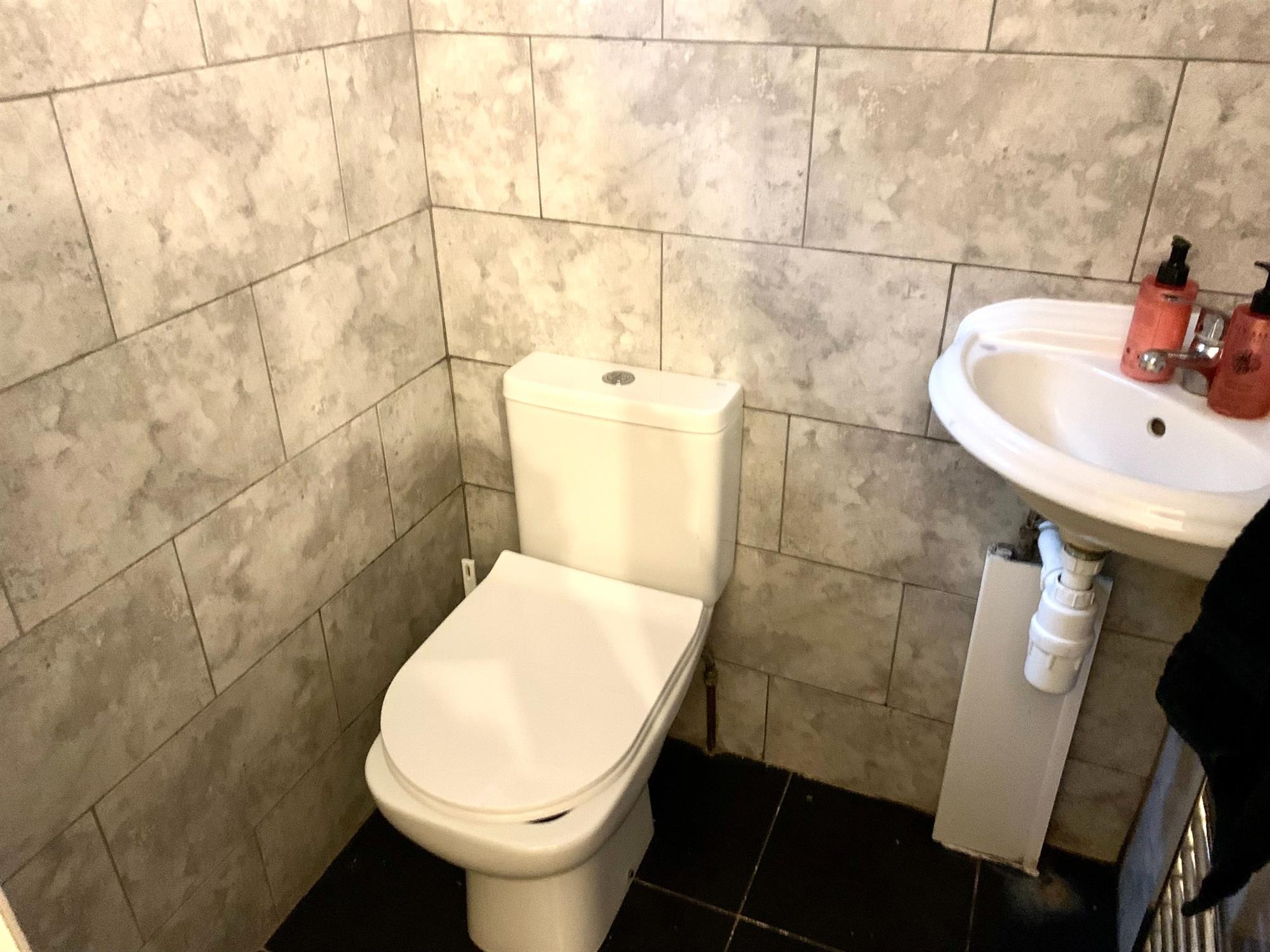 White suite comprises toilet and sink.
