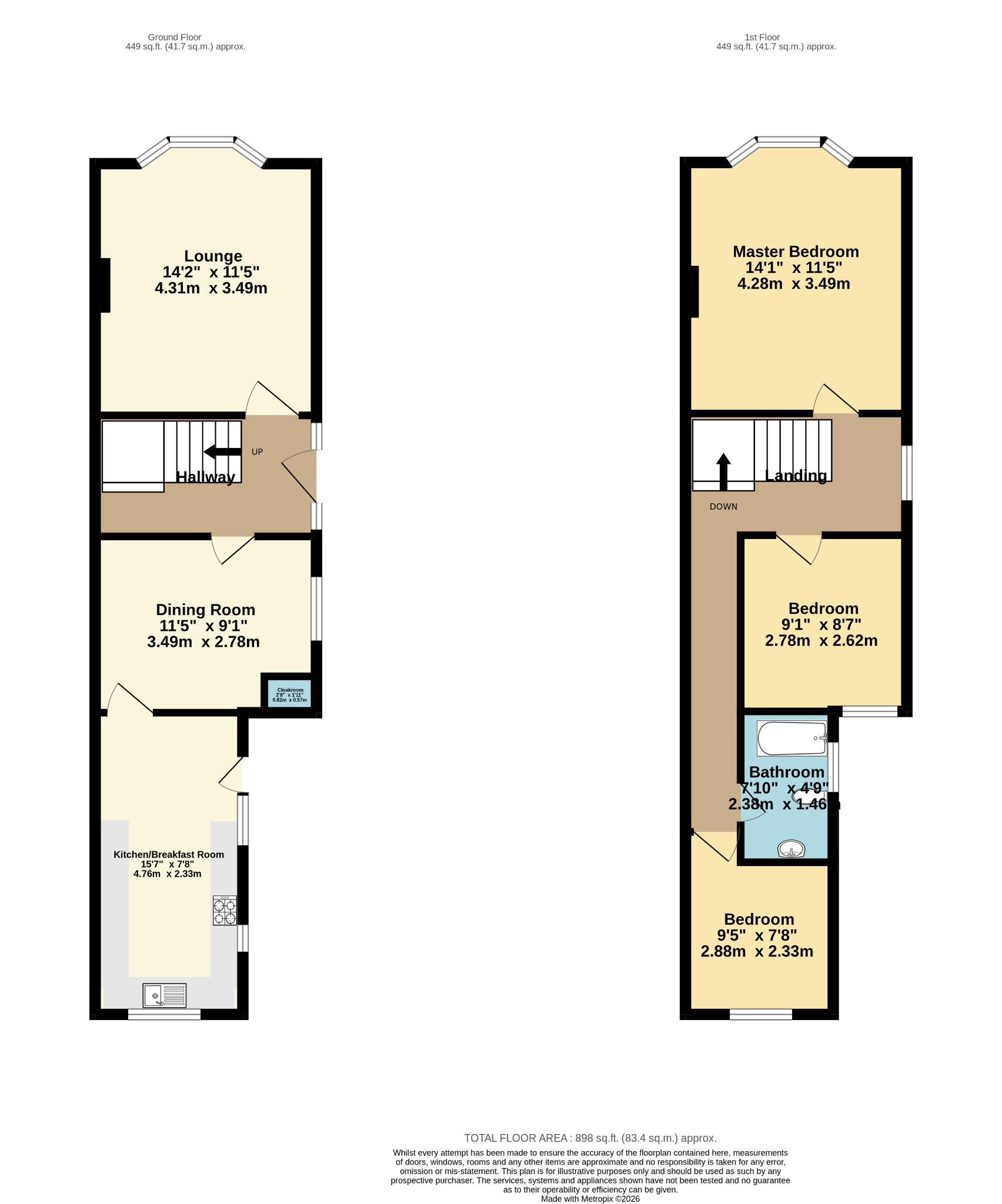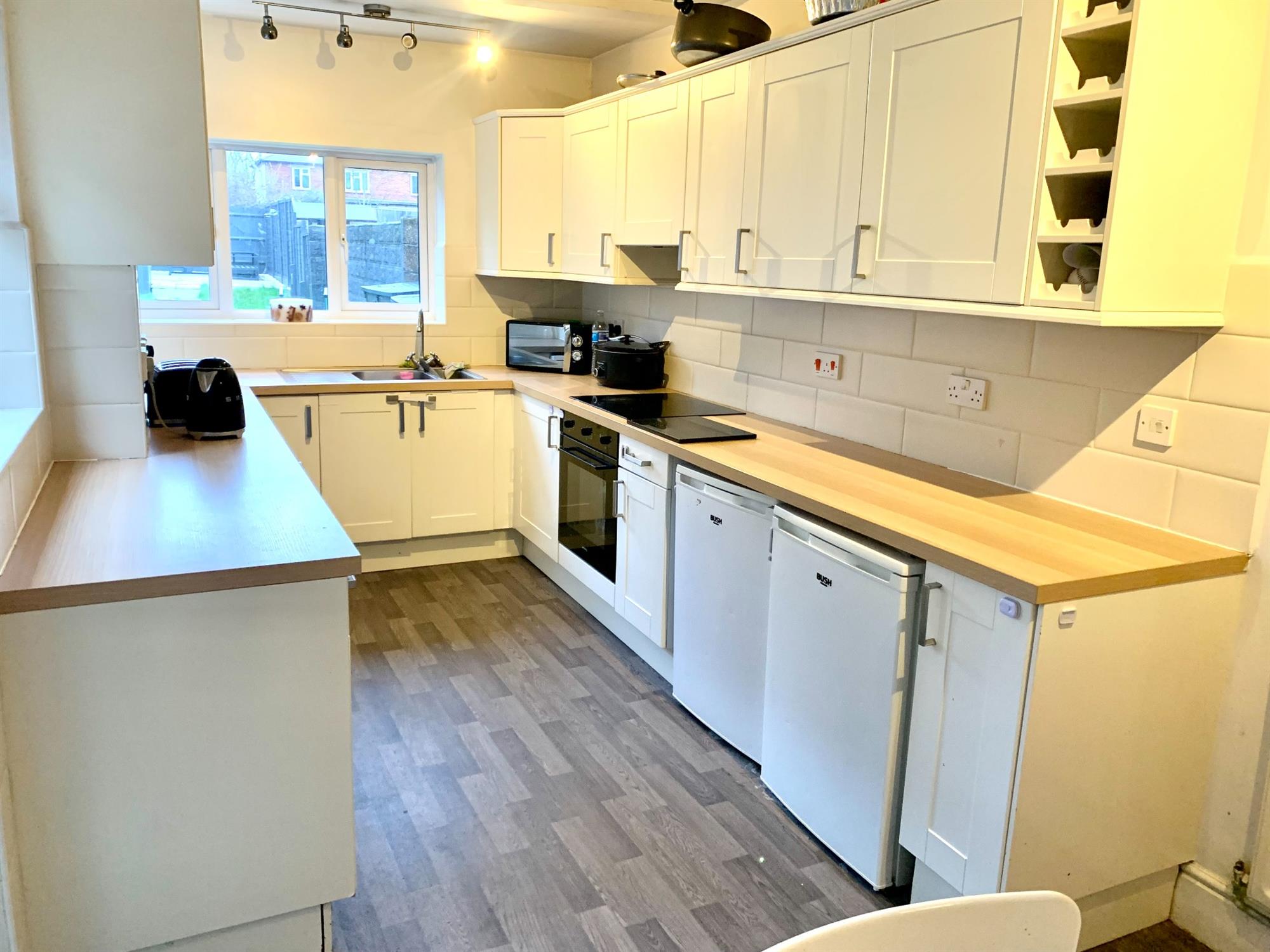 Spacious kitchen with various wall and base units and space for table and chairs. Dual aspect windows allows plenty of light and door to back garden. Appliances consist of: electric hob and electric oven. Space for under counter fridge, under counter freezer, dishwasher and washing machine.