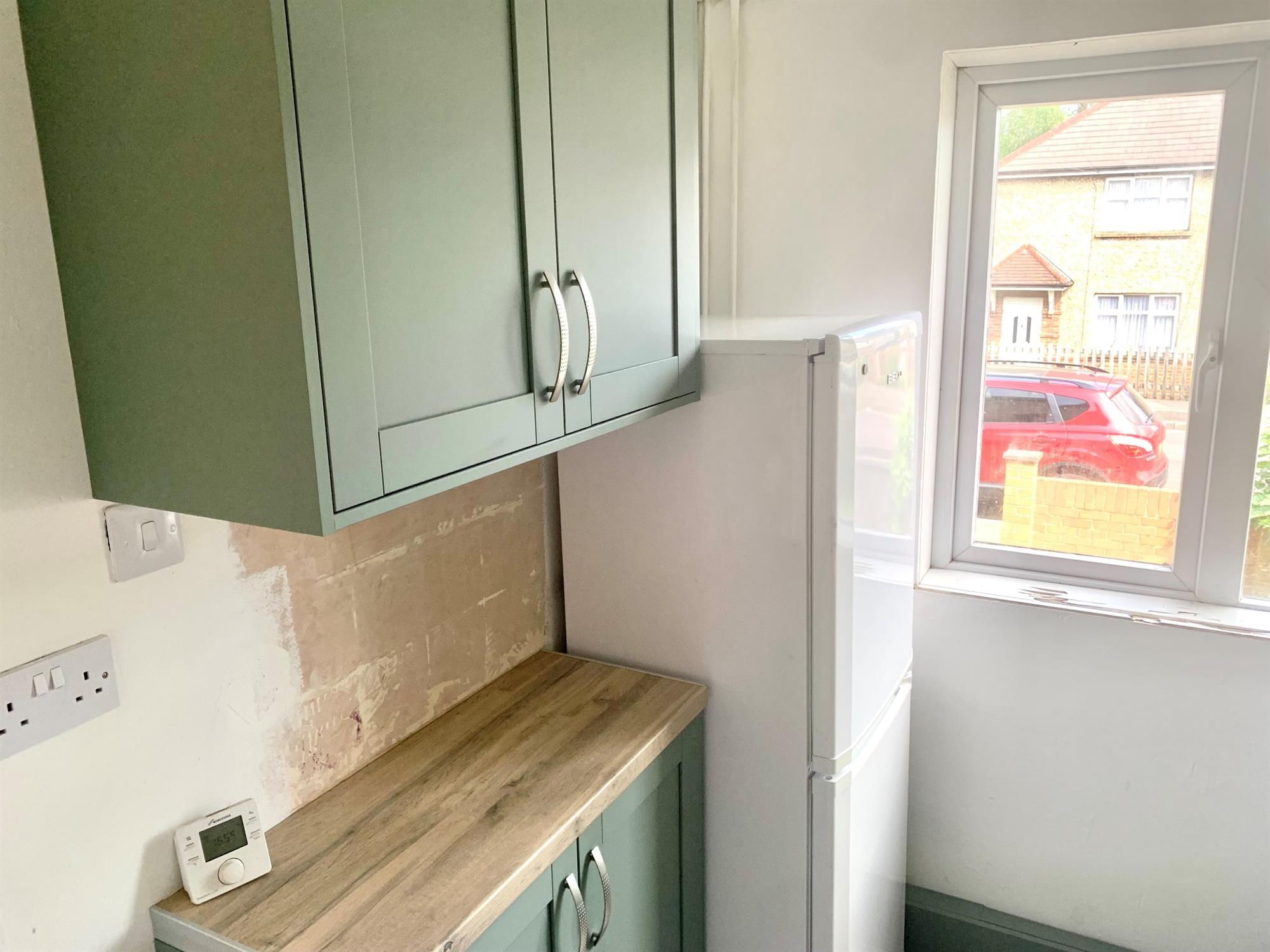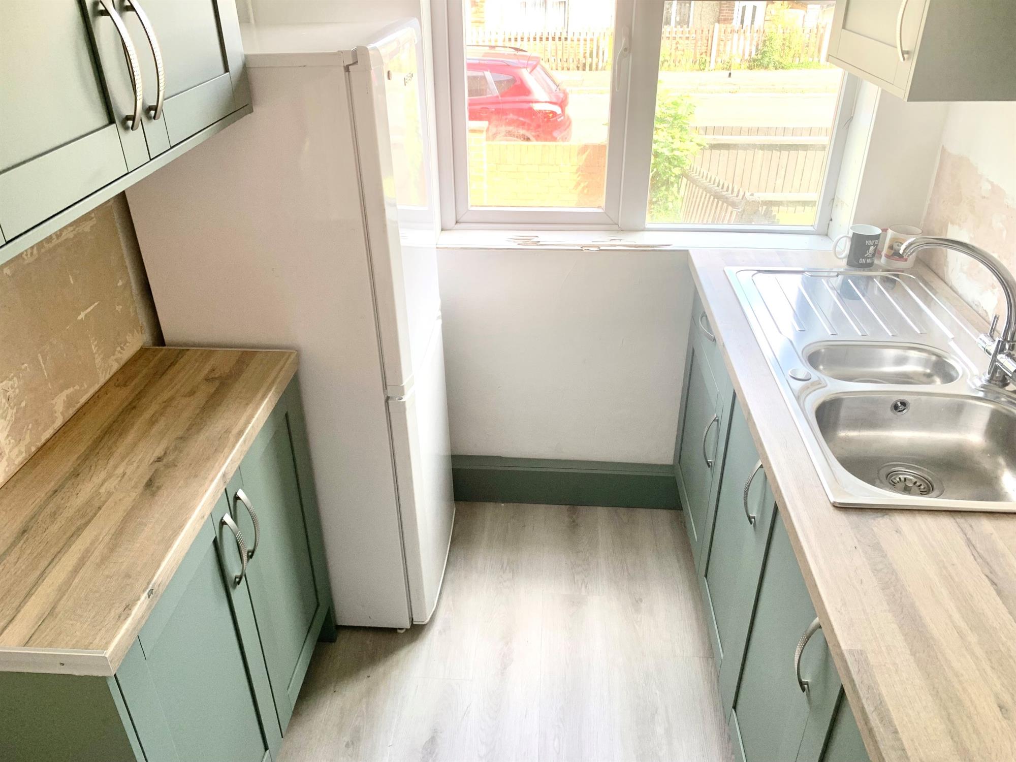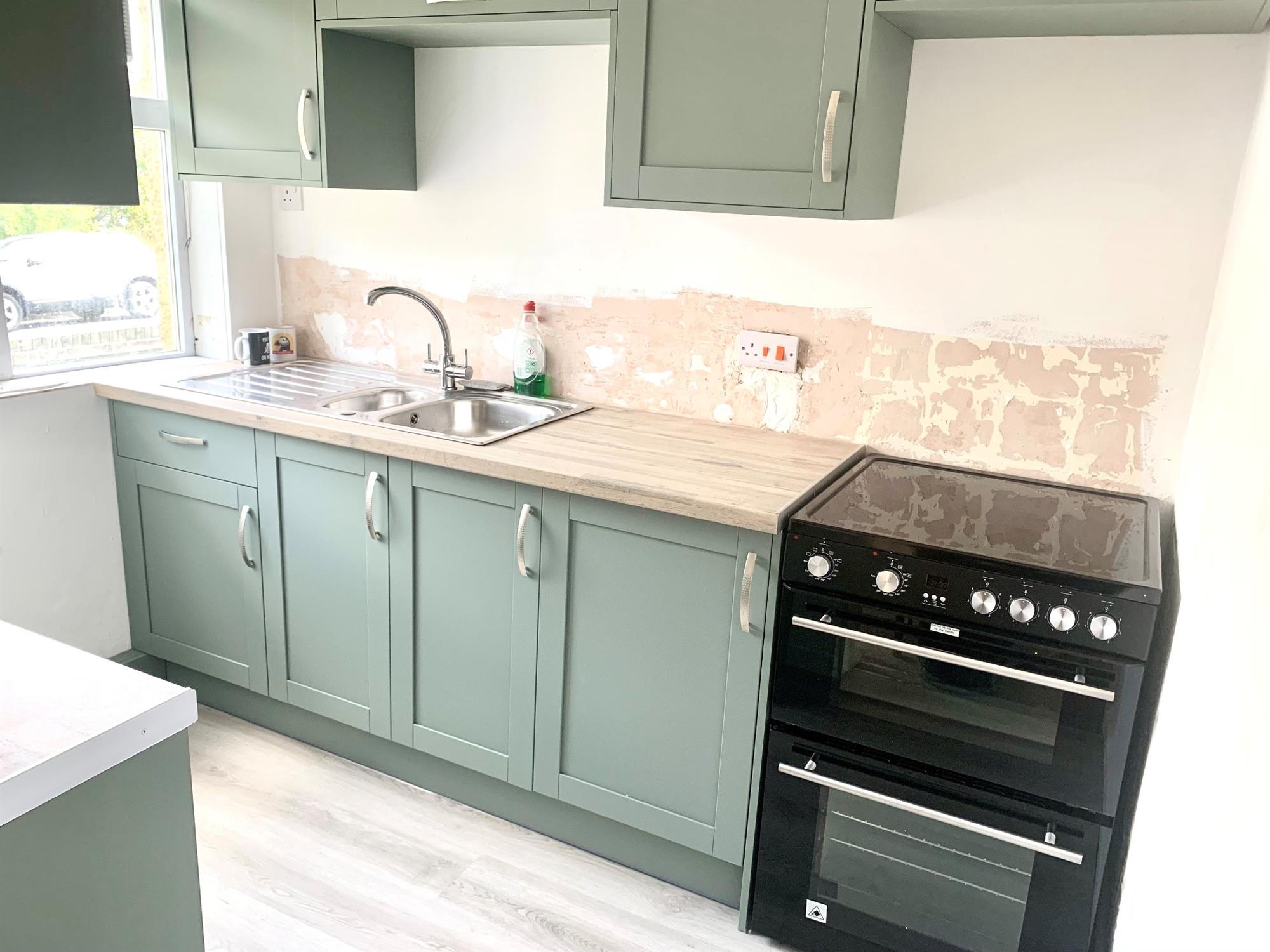 KITCHEN – Newly installed kitchen with various wall and base units. Window to front. Appliances consisting of: fridge/freezer and new double electric oven. (w/machine located in lounge cupboard).