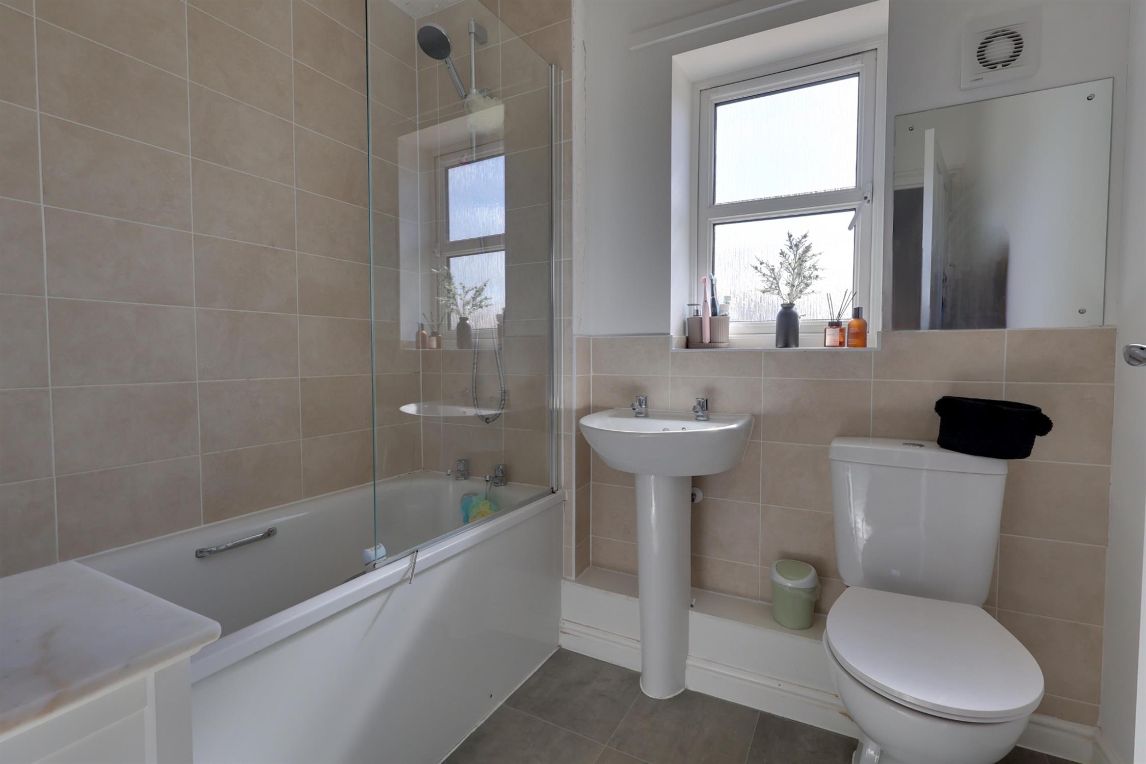 Upvc obscured double glazed window to side aspect. Close coupled WC, wash basin, panelled bath, glass shower screen with shower and tiled surround.