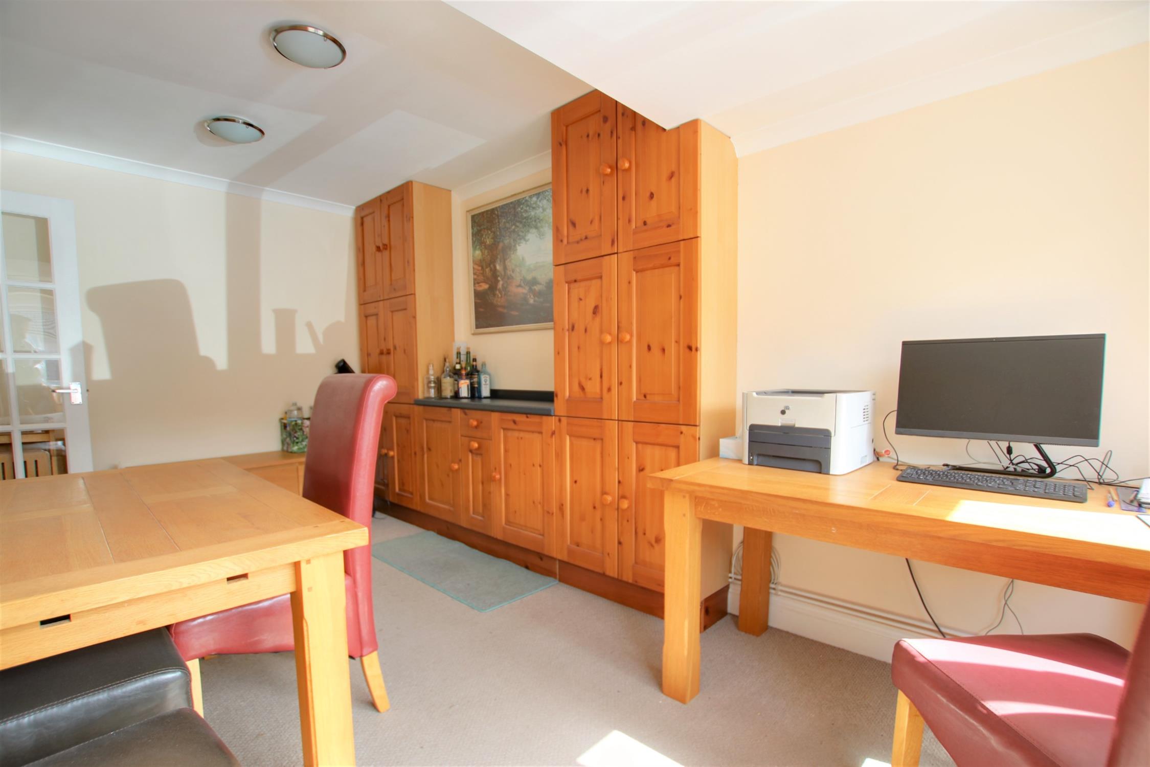 From here, there is a access to the ground floor accommodation, and stairs that rise to the first floor. The open-plan kitchen/living room is L-shape and is the heart of the home. The living area is double aspect and particularly generous in size, spanning across 20ft. From here, double doors lead to the rear garden, and there is also an electric fireplace. The kitchen is contemporary in style and fitted with a range of eye and low-level units with handleless drawers and doors, and integrated appliances. A door from the kitchen provides access to the utility room which in turn leads to the rear garden. The utility room is also fitted with a range of eye and low-level units, with sink and space for whitegoods, and the boiler is less than a year old. The garage has been converted into another reception room, which currently serves as a spacious dining room and offers built in storage. Finishing off the ground floor is a study with access to mezzanine room, WC, and under stair storage.