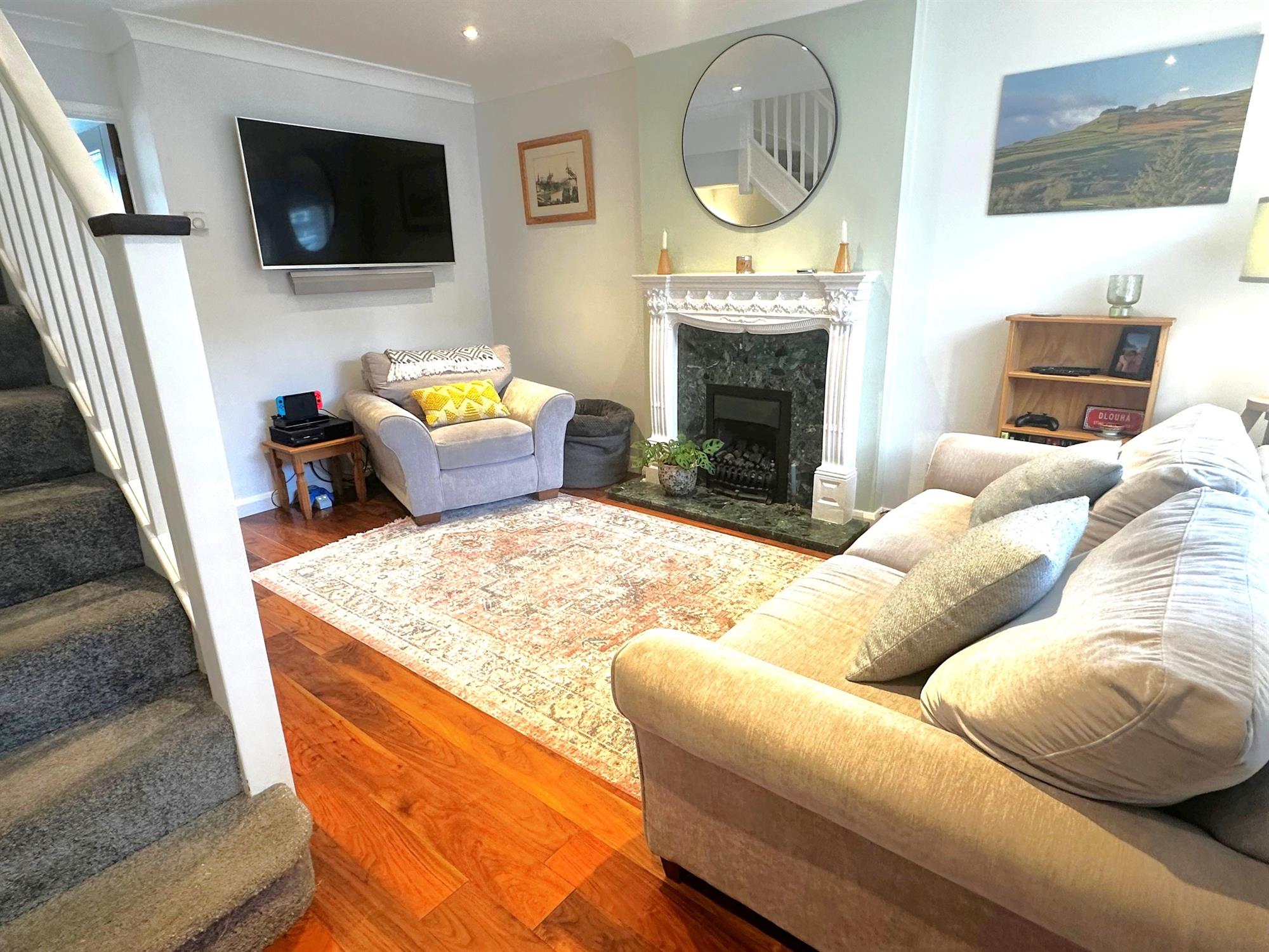 Window to front aspect with shutters fitted. Stairs to first floor with recess below. Feature fireplace with gas fire fitted. Engineered walnut flooring. Radiator. Door to: