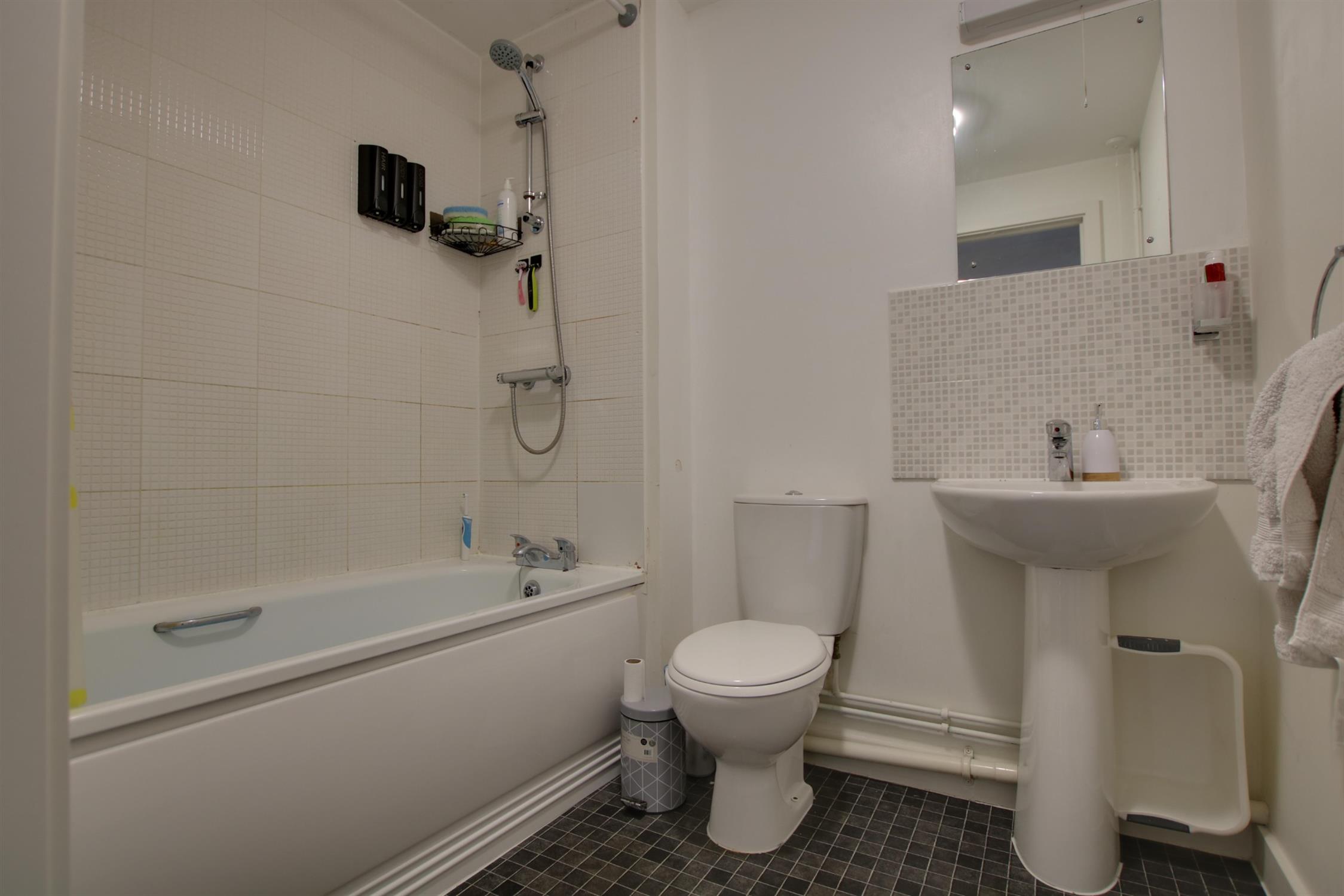 Vinyl flooring. Panelled bath with bar valve shower over, pedestal ceramic wash basin and w.c. Radiator. Smooth walls and ceiling. Extractor fan.