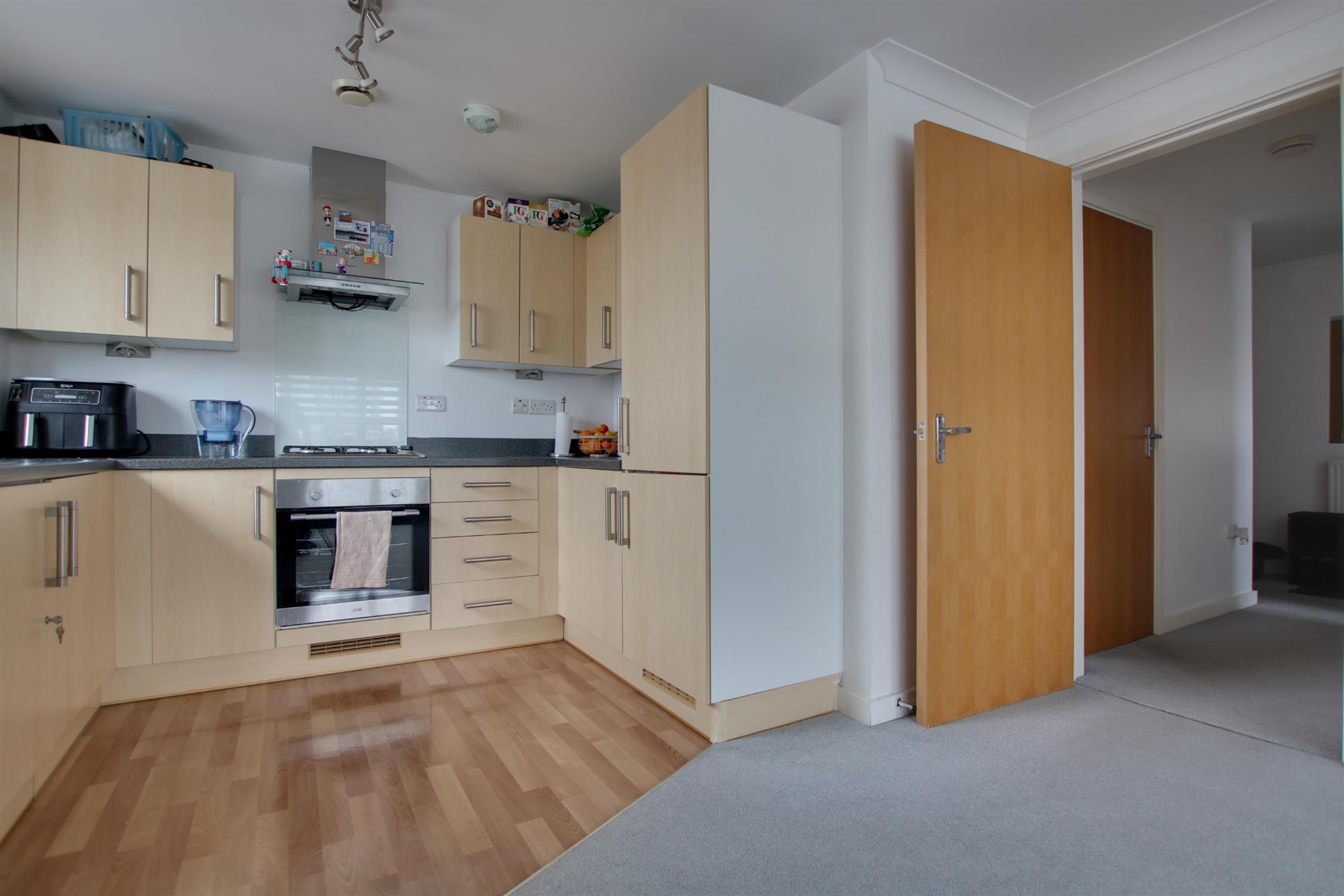 Wood effect vinyl flooring in kitchen area. Wall and base units with worktop over. Sink and drainer. Four ring gas hob, integrated fridge/freezer and washing machine. Dual aspect double glazed windows to side and rear. Smooth walls and ceiling. Electric oven. Radiator. Cupboard housing combi boiler.