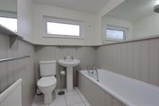 Double glazed window to the front aspect. Suite comprising bath with hand shower. Wash hand basin. Low level WC. Part feature panelled walls. Radiator. Tiled flooring. Airing cupboard.
