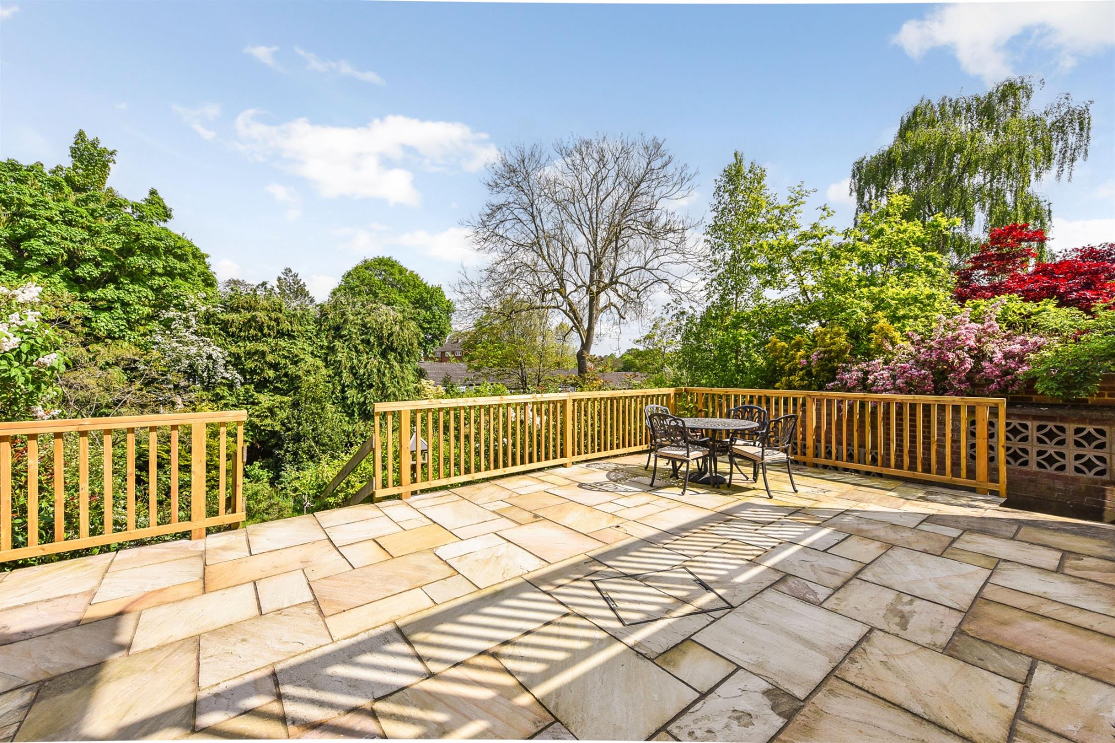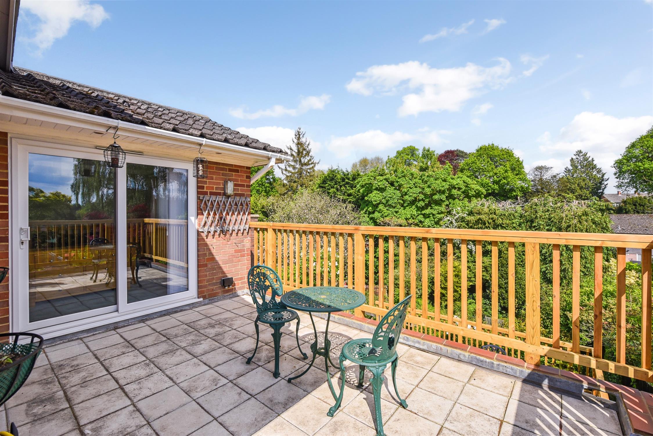 The ground floor front aspect is entered by a neat hallway with a useful guest cloakroom, leading to an impressive living room expanding across the full width of the property, with an attractive bay window and centred upon an open fireplace with a wood burning stove. This links directly with the kitchen, benefitting from an elevated rear aspect. This space would lend well to the creation of open-plan living and could be afforded direct outside access via the addition of doors from the kitchen to a large balcony which currently only serves the principal bedroom. The substantial master suite also enjoys elevated garden views and has doors out onto a beautiful balcony, together with a luxurious en-suite shower-room and built-in storage.